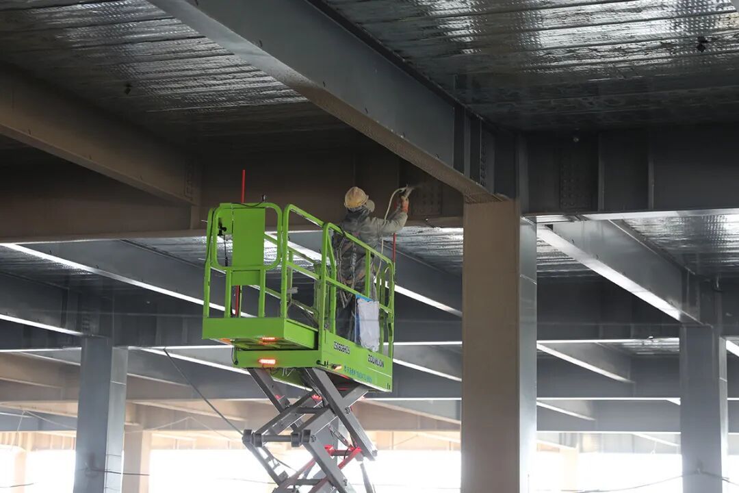 楼体内部,防火涂料喷涂作业正在进行。外部施工机械上,外墙龙骨焊接工作有序开展,二次结构施工与外立面工程同步推进,各环节衔接紧密、效率高效。
