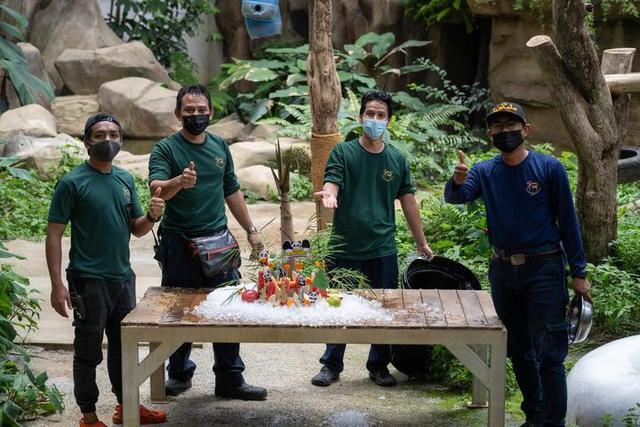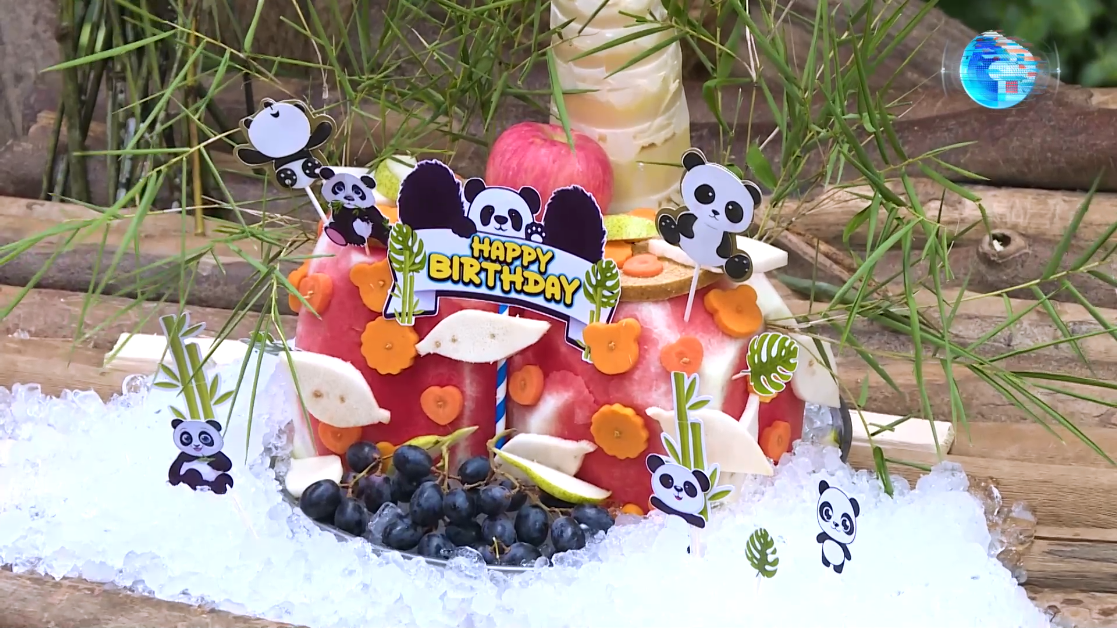 保护中心的工作人员为两位寿星分别准备了“生日蛋糕”——这是一场水果盛宴,西瓜、苹果、葡萄、梨等拼出造型,胡萝卜雕成心形、大熊猫形状用作点缀,最后用冰块定型。