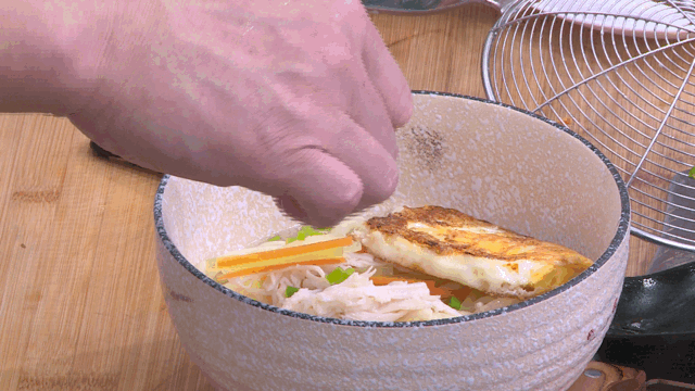 3.碗上一边放鸡蛋,一边放青菜,中间放三丝即可。