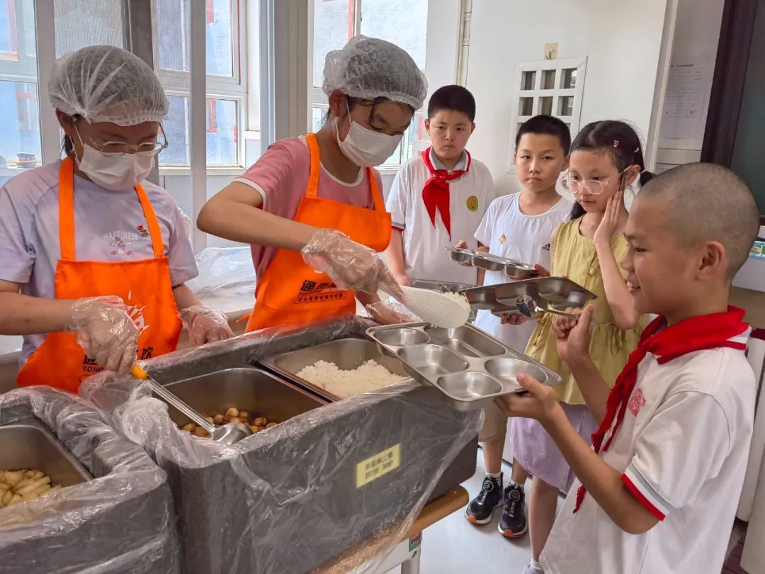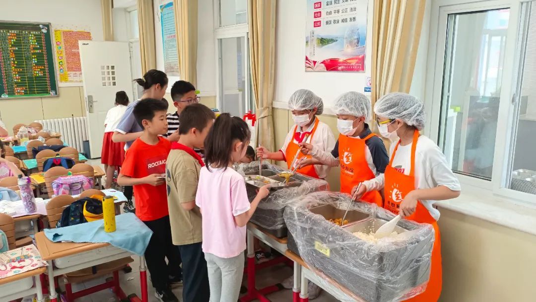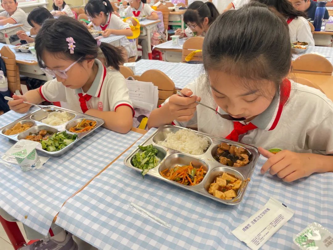 “我爱吃青菜,请帮我多盛点”、“米饭吃不完不用太多”……同学们有序排队,按需打饭。灵活的“桶餐到班”供餐模式为同学们用餐选择提供了一定自主权,这不仅有助于增强学生的饮食自主性,还能培养健康的饮食习惯。学生们“自己动手,丰衣足食”,既避免浪费,又培养了劳动能力、自我管理能力和集体意识。