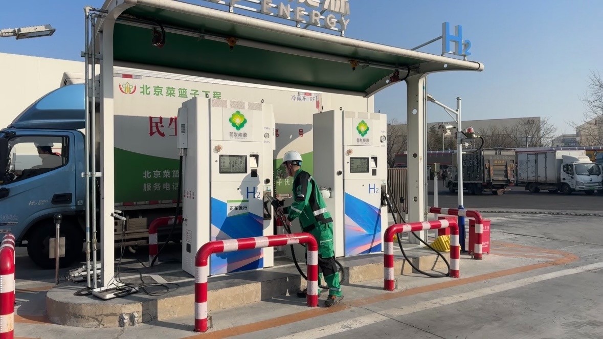 春节临近,物资运输需求旺盛。站内除了私家车,还有不少货运车辆往来穿梭。一辆运输蔬菜的氢能配送车正停靠在加氢区,司机于师傅已成了这里的常客:“加氢速度跟加油其实差不多,来了之后先把车辆的专属二维码给到加油员,他去测车辆的是否漏氢,就可以正常加氢了,大概就3-4分钟。”
