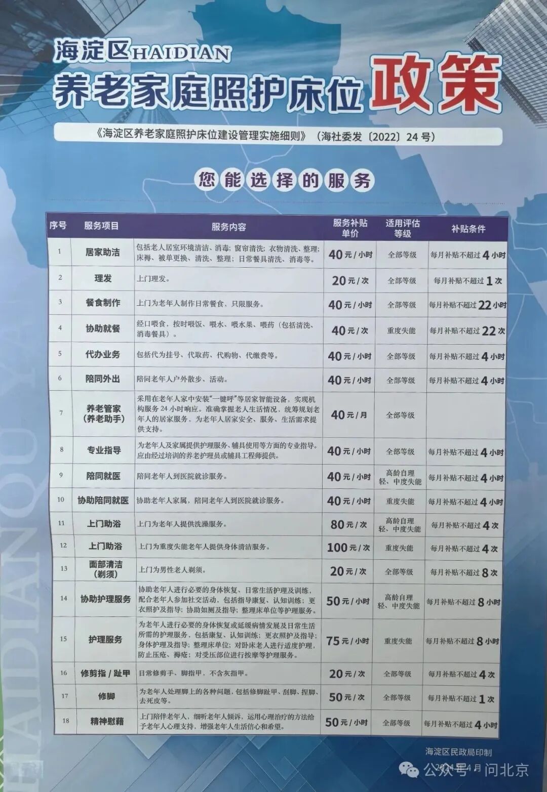 随后,“问北京”记者查询到了海淀区民政局印制的“海淀区养老家庭照护床位政策”宣传海报,其中具体标明了补贴适用的项目,包括40元每小时的居家助洁、20元一次的上门理发、40元一小时的上门餐食制作、50元一次的修脚和50元一小时的上门精神慰藉等18大类的服务项目。