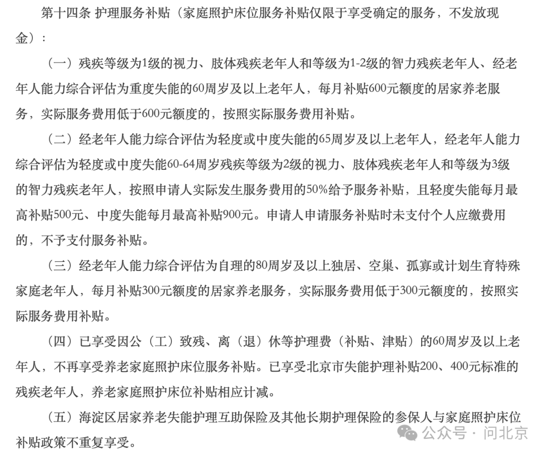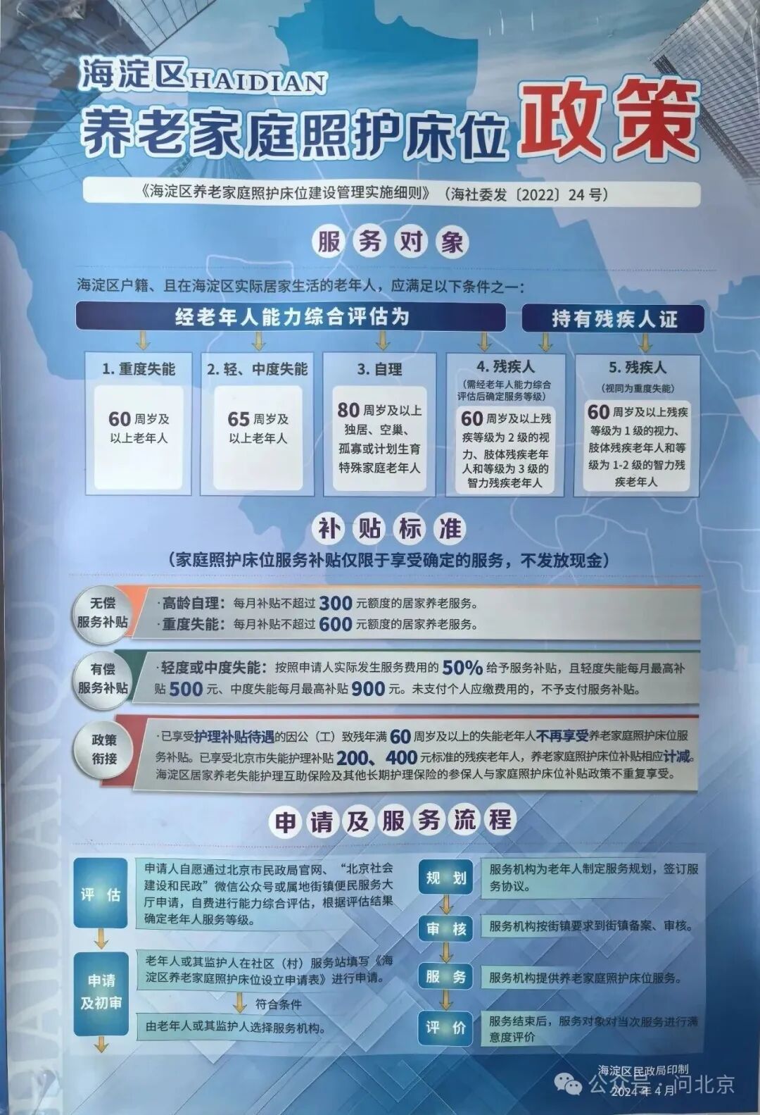 为贯彻落实《北京市居家养老服务条例》,进一步聚焦居家养老服务保障,2024年9月,海淀区民政局印发《海淀区养老家庭照护床位建设管理实施细则(修订)》的通知。其中表明,具有海淀区户籍且在海淀区实际居家生活,经老年人能力综合评估为自理状态,且年满80周岁及以上的独居、空巢、孤寡或计划生育特殊家庭的老年人,可享受每月300元额度的居家养老服务补贴。