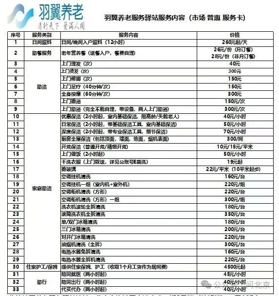 羽翼养老服务驿站服务内容(市场普惠服务卡)价目表