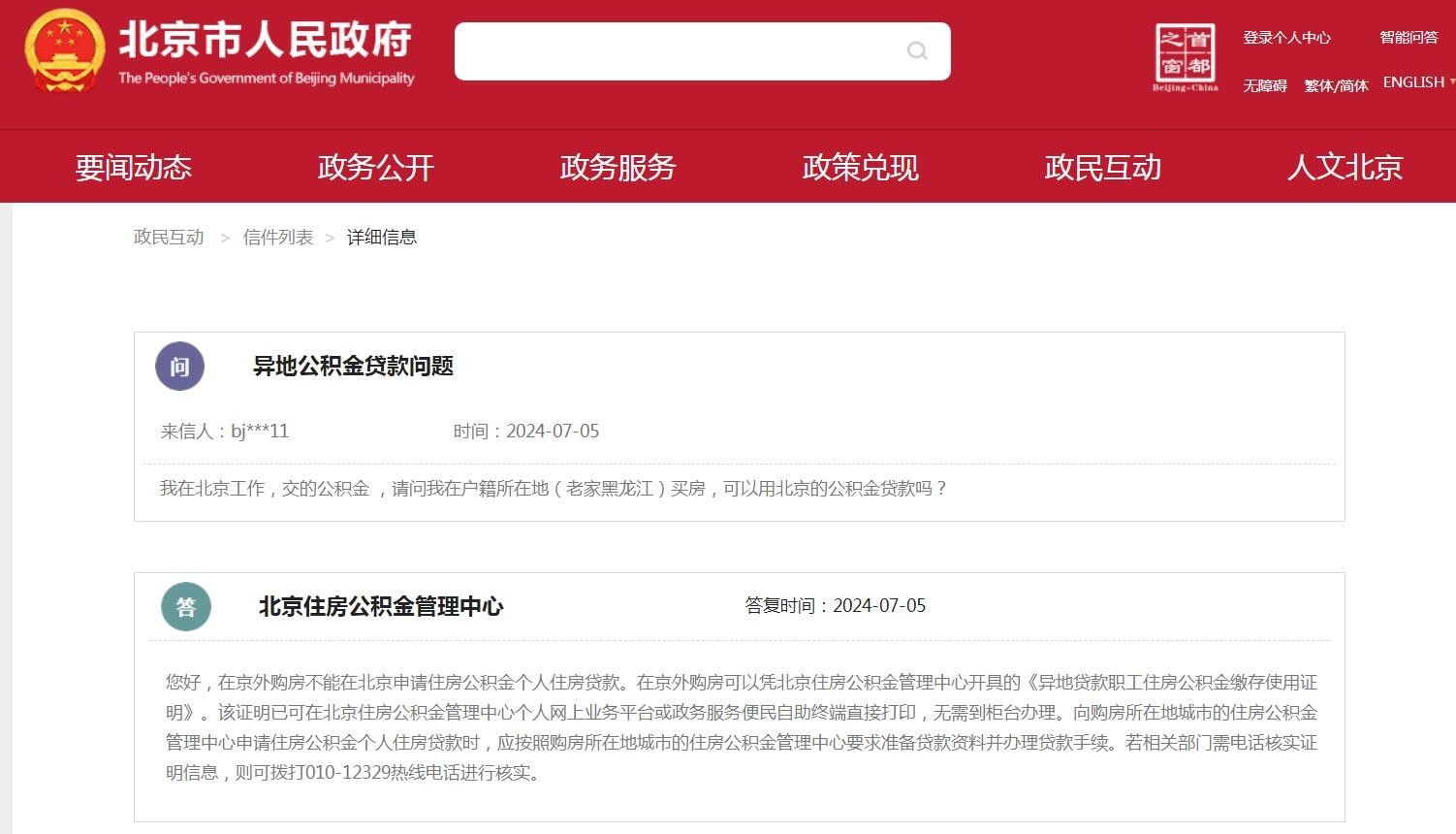 近日有市民通过北京市政府网站提问:我在北京工作,交的公积金 ,请问我在户籍所在地(老家黑龙江)买房,可以用北京的公积金贷款吗?