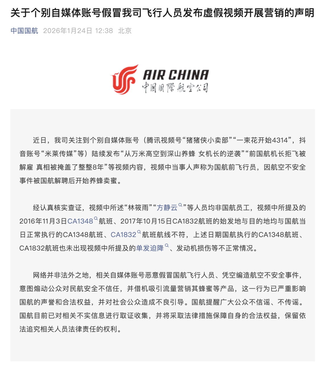 1月24日,中国国航微信公众号发布《关于个别自媒体账号假冒国航飞行人员发布虚假视频开展营销的声明》——