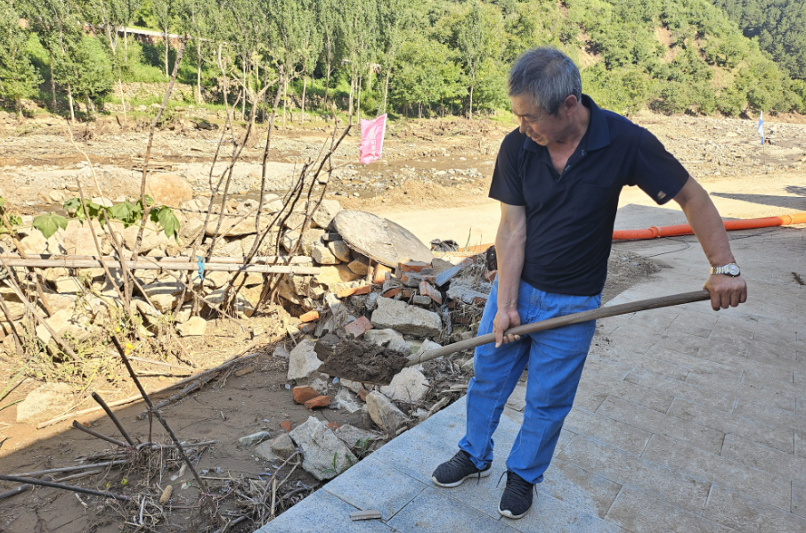 三亩地自然村的范京田、尹建菊夫妇一进门就没闲着:范京田挥着铁锨清理门口淤泥,尹建菊摘下架上长老的黄瓜,又查看起长势正好的丝瓜。“政府帮了我们太多,现在回家了,就得自力更生,邻里互相帮衬着重建。”尹建菊的话道出了大家的心声。