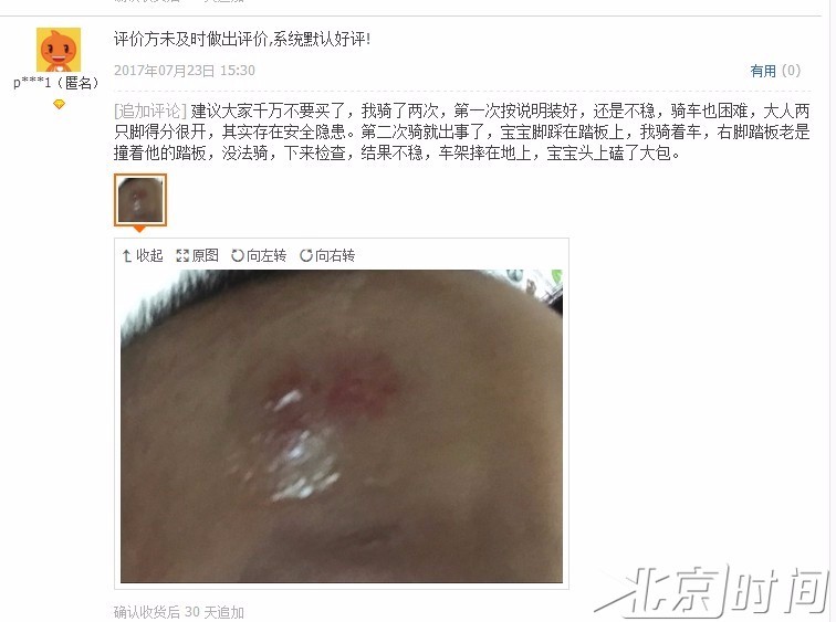 虽然销量挺高,而且好评也不少,但记者看到一个家长给了一个追评。其表示,安装上去之后骑车很困难,而且第二次就出了问题,因为不够稳固,结果孩子摔倒,头上磕了大包。
