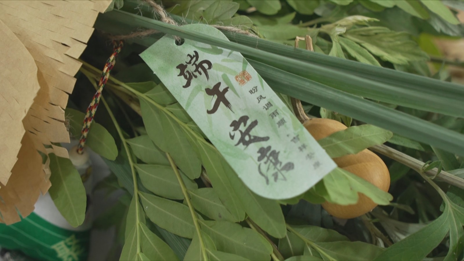 除了基础款之外,一些花店还将艾草和其它花材包装成精美花束,选择艾草、菖蒲叶垫底,加入黄金球和不同形状的玉簪叶,来增加纯绿花束的亮点,不仅如此,为丰富其层次,花束里还加入样式可爱的香囊、小葫芦,外包装纸上写着“端午安康”的吉祥语,这类设计感更为丰富的艾草花束价格在39至48元左右,成了花市里一道特别的风景,也吸引了不少市民前来选购。