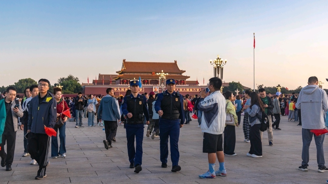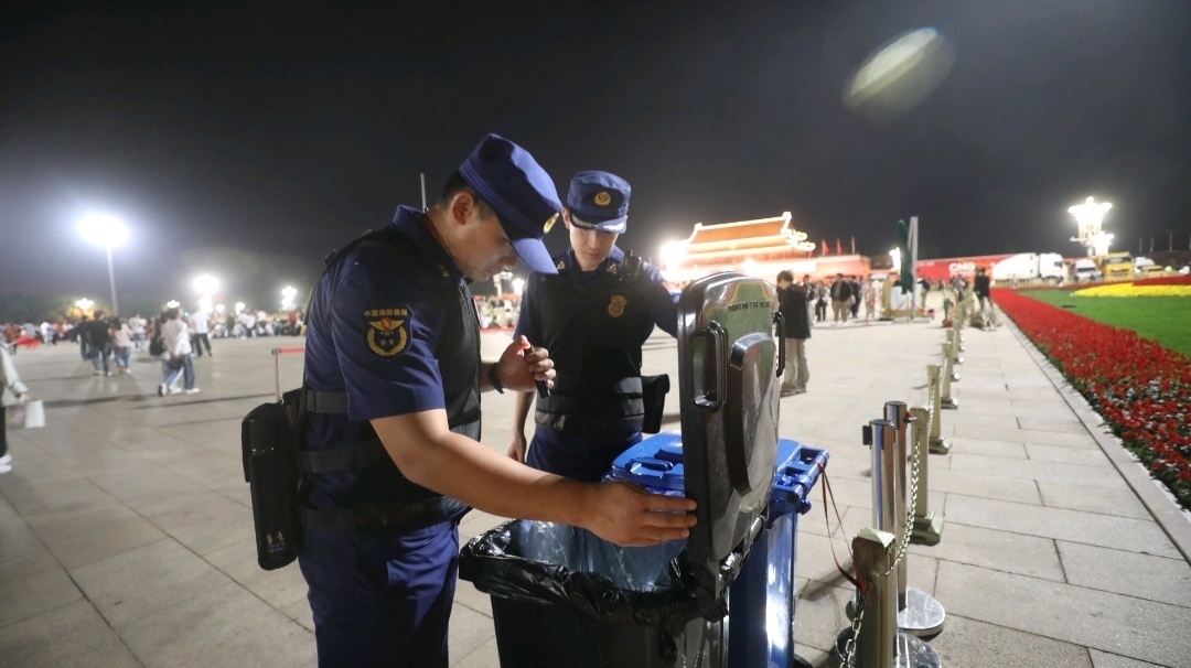 22时许,记者来到天安门广场,虽然离升旗还有8个多小时,观礼区域的群众从内到外已经排了十多层,在不断涌来的人流中,记者见到正在执勤的庞涛,今年33岁的他当消防员14年,现任天安门特勤站站长,这是他在广场上度过的第九个国庆节。“我们将广场划分为四个网格,每两名队员巡视一个网格。此外,还有三个点位分别驻守着一辆消防吉普车,我们的主要任务是消除动态火灾隐患和向游客提供暖心服务。”庞涛一边介绍,一边熟练地展示身上的“消防八件套”,其中既有电流、可燃气体和温度等方面的检测仪,也有防切割手套、破拆器和手电等工具,还有一个小型的水基灭火器。