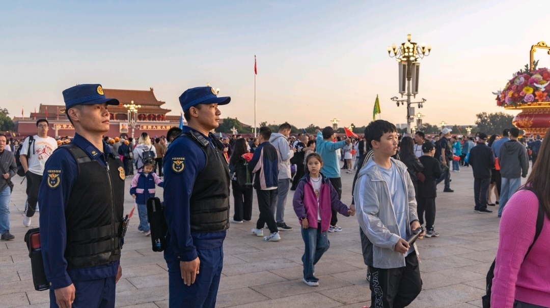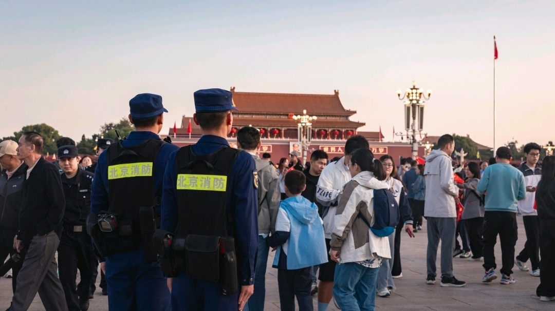 10月1日,迎着清晨第一缕阳光,五星红旗在天安门广场冉冉升起。在观看升旗仪式的群众身后,一抹醒目的“火焰蓝”停下巡逻的脚步,向着国旗行注目礼——自前一晚广场开放,保障升旗仪式的消防员们的脚步就未曾停歇,从夜晚到清晨,他们以细致入微的工作,为观礼群众提供贴身守护。