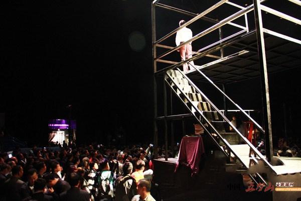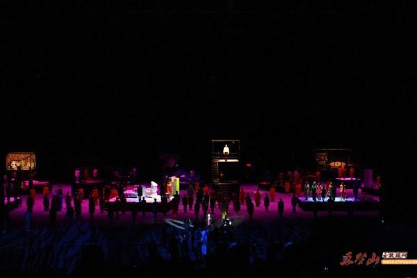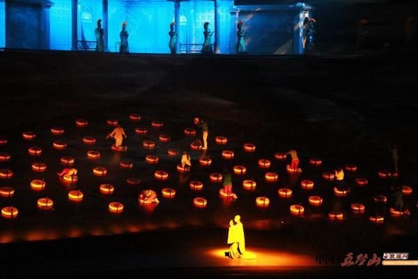 进入五台山的路上就感受到了佛教无处不在的影响,而在2014年9月19日全球首演的《又见五台山》,也是导演王潮歌对人生与佛理的追寻雨思考。整场表演展现了人到中年之后回想的过去与种种困扰,以及佛法对人生、时间等等诸多问题的阐释。伴随着每位观众受众传递的铜钵敲打的回响,聆听着僧人手中银铃的荡涤,由灯光呈现的虚幻的庙宇间,仿佛又见一百年的雨雪,又见五百年的苍柏,又见一千年的经卷,又见两千年的五台山,又见前生的我,又见来世的你,又见修行者的一次匍匐,又见布施主的一念慈悲,又见护法神的一次普渡。感受一念的漫长与短暂,也体会到人皆可成佛的祝愿。