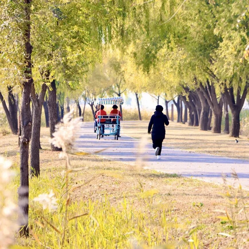 骑行道旁的金柳飘舞