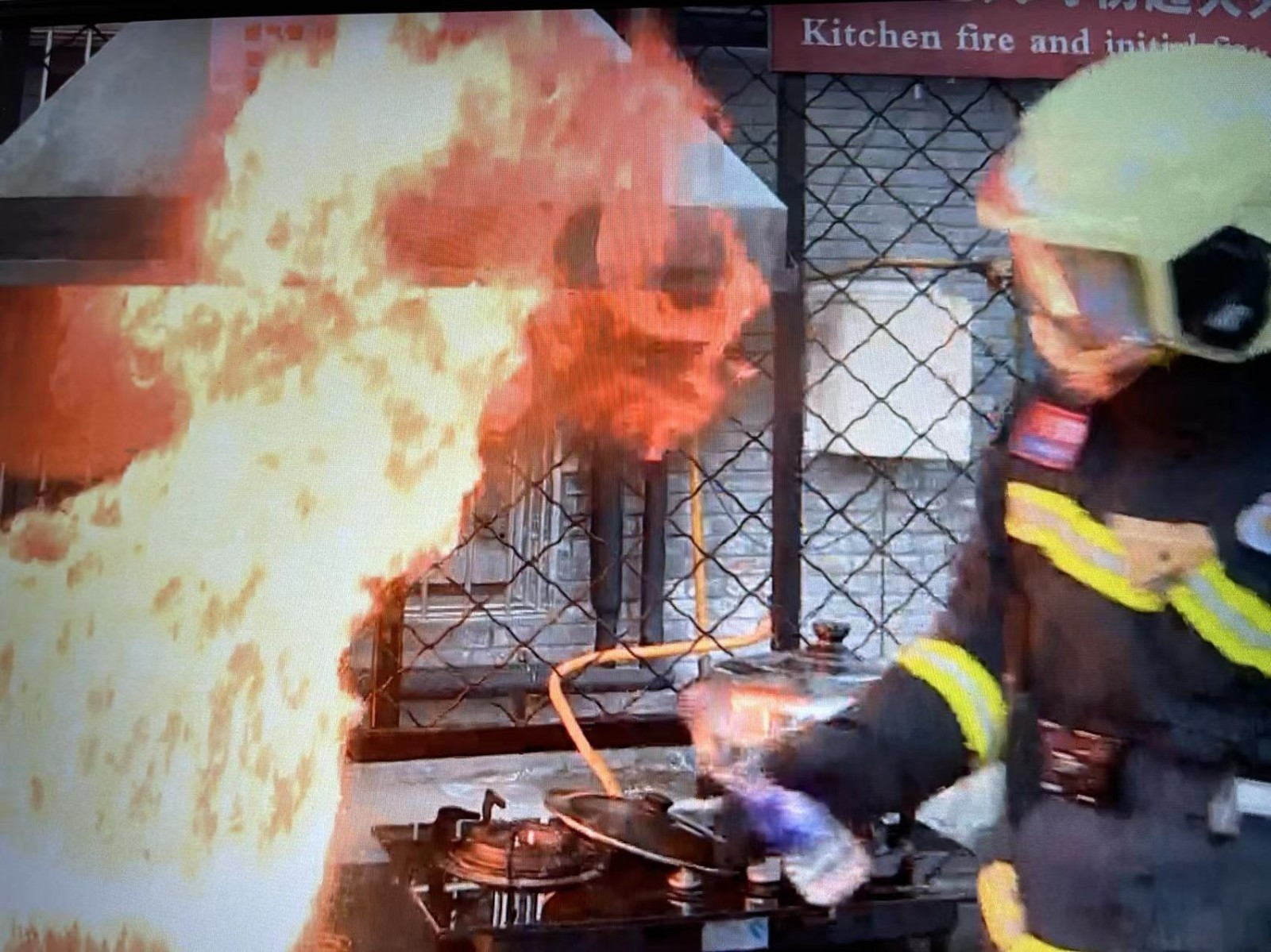 油锅着火危险大,消防教您来灭火。