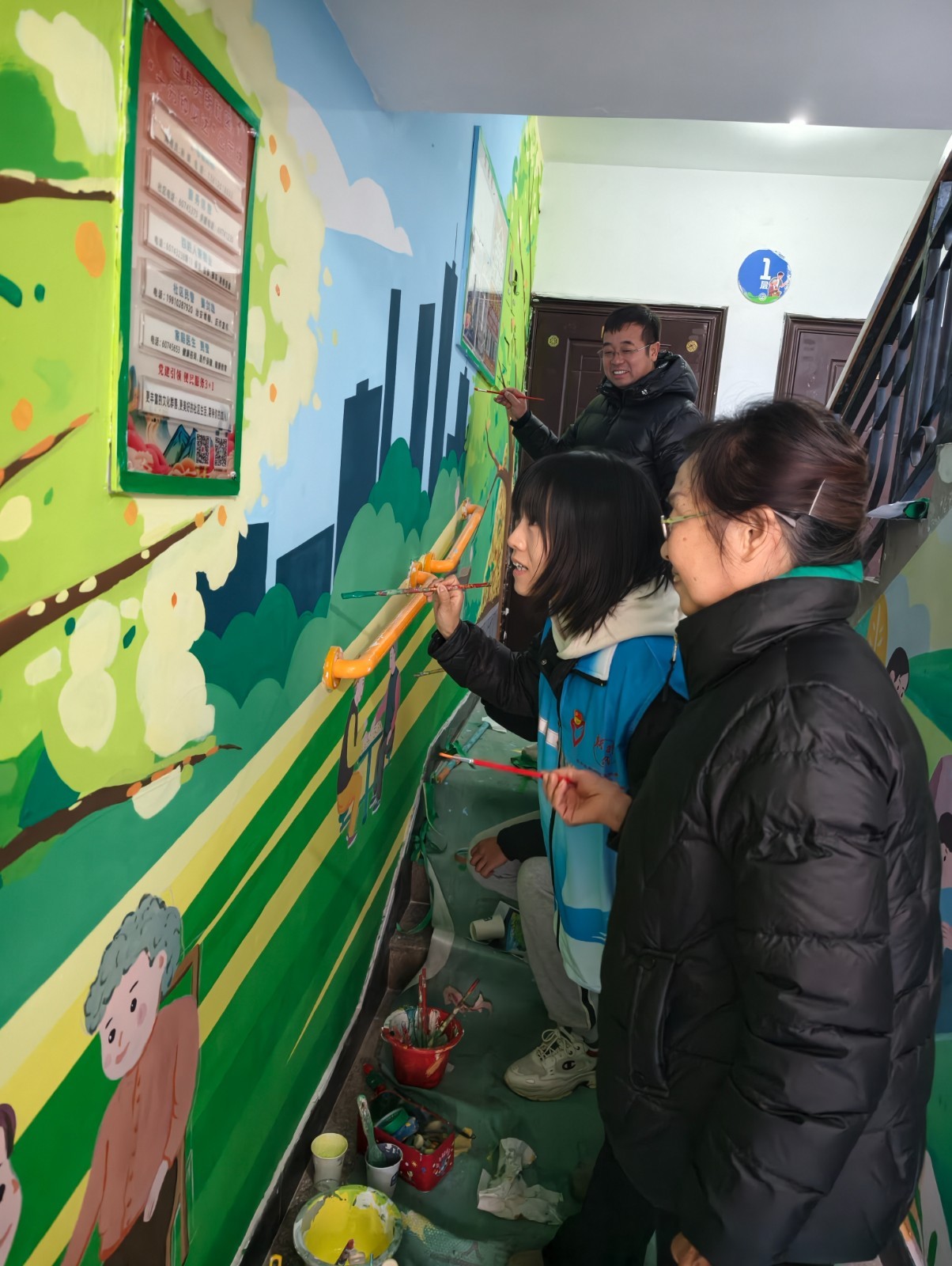 楼门,是居民回家的“第一道风景”,也是社区治理的“最后一米”。如何让这道风景既美又暖?答案是把画笔交给居民。世涛天朗社区通过邻里座谈会、线上征集,广泛倾听民意,最终选定两个楼门作为试点。方案既定,社区物业率先行动,承担了墙面的基础整治工作:先对墙面坑洼处进行填补、对老旧涂层做了刮腻子处理,随后统一用环保涂料完成墙面刷白,同时提供翻新所需的滚筒、刷子等工具,为后续社区创作打好平整干净的“画布”。随后,真正的“主角”登场了:社区里的书法、绘画爱好者捐出原创作品,楷书端庄,隶书古朴,为楼门注入文化底蕴;由老中青少四代居民组成的“彩绘小队”更是同心聚力,将春芽、雏菊、祥云等图案与邻里嬉戏的生活场景搬上墙面。“以前楼道光秃秃的,现在一进门就是字画和彩绘,每天回家都觉得心里暖暖的!”家住21号楼的“小玉米妈妈”笑着说。她特意带着孩子参与彩绘,希望“在孩子心里种下爱社区、传文化的种子”。