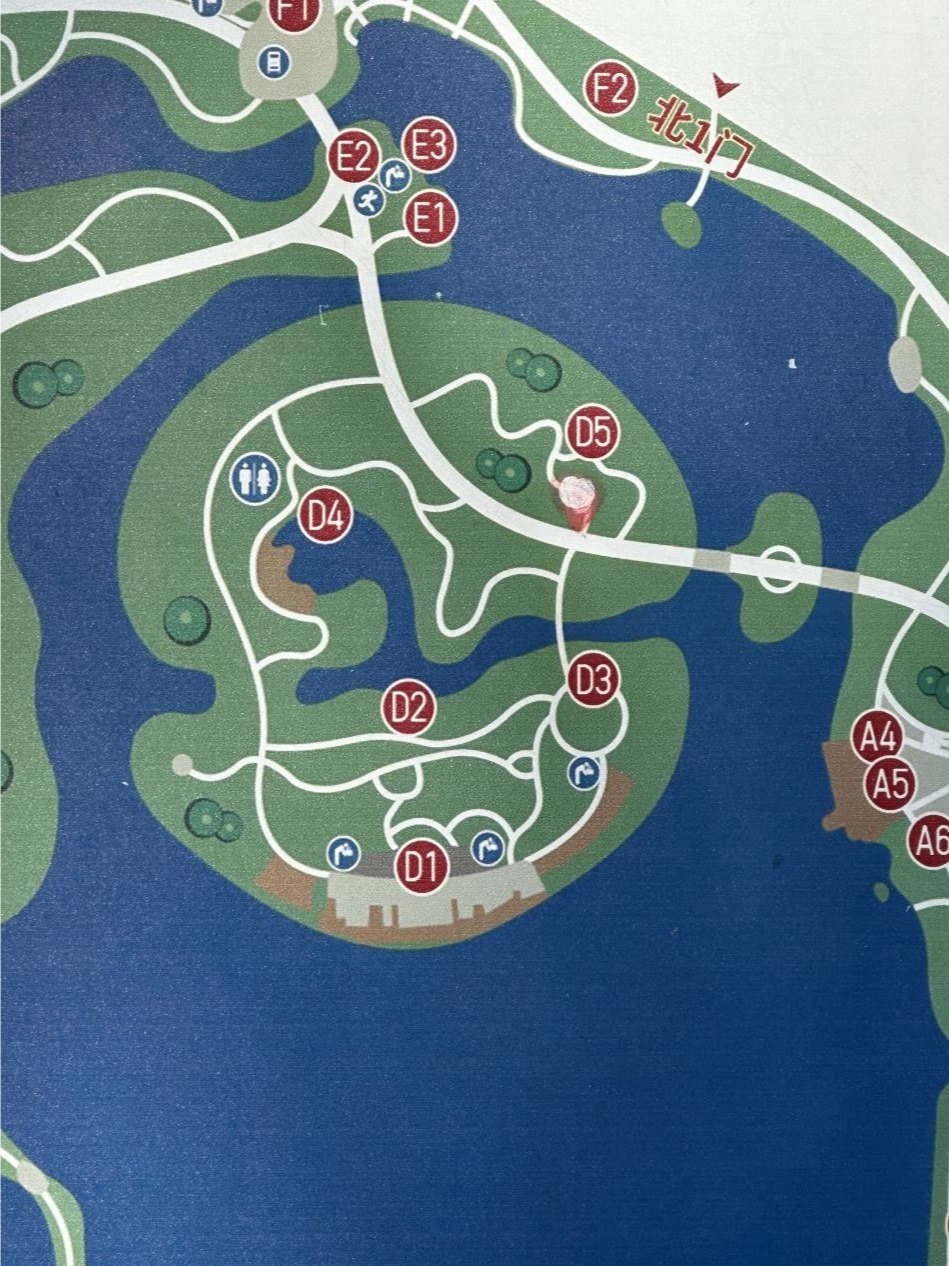 大兴区念坛公园内的导览图数量虽多,但“您所在位置”标识设置地却相当混乱。在公园东大门、北大门、南大门等出入口以及部分景点旁的导览图上,“您所在位置”图标清晰醒目,便于游客入园后快速定位。而路边、交叉路口的导览图上,这一关键标识却并非原始印刷,而像是后续补“画”上去的,颜色暗淡、轮廓模糊,与导览图鲜亮的底色形成强烈反差,不仔细观察也很难发现。
