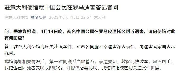 答:驻意大利使馆高度关注该案件,对两名同胞不幸遇害深表哀悼,向遇害者家属表示慰问。