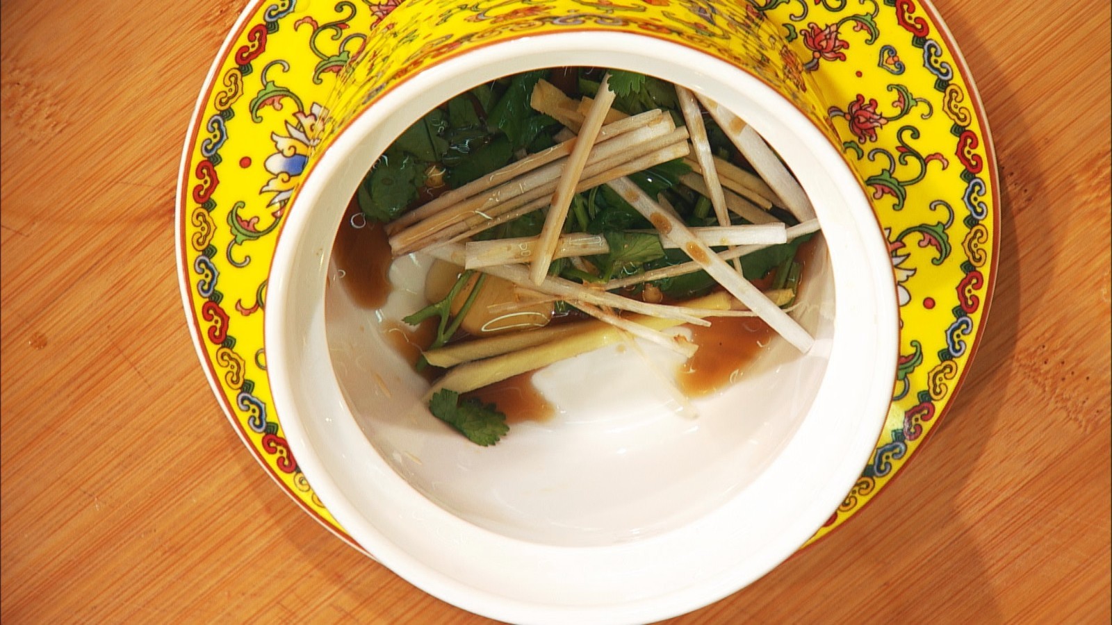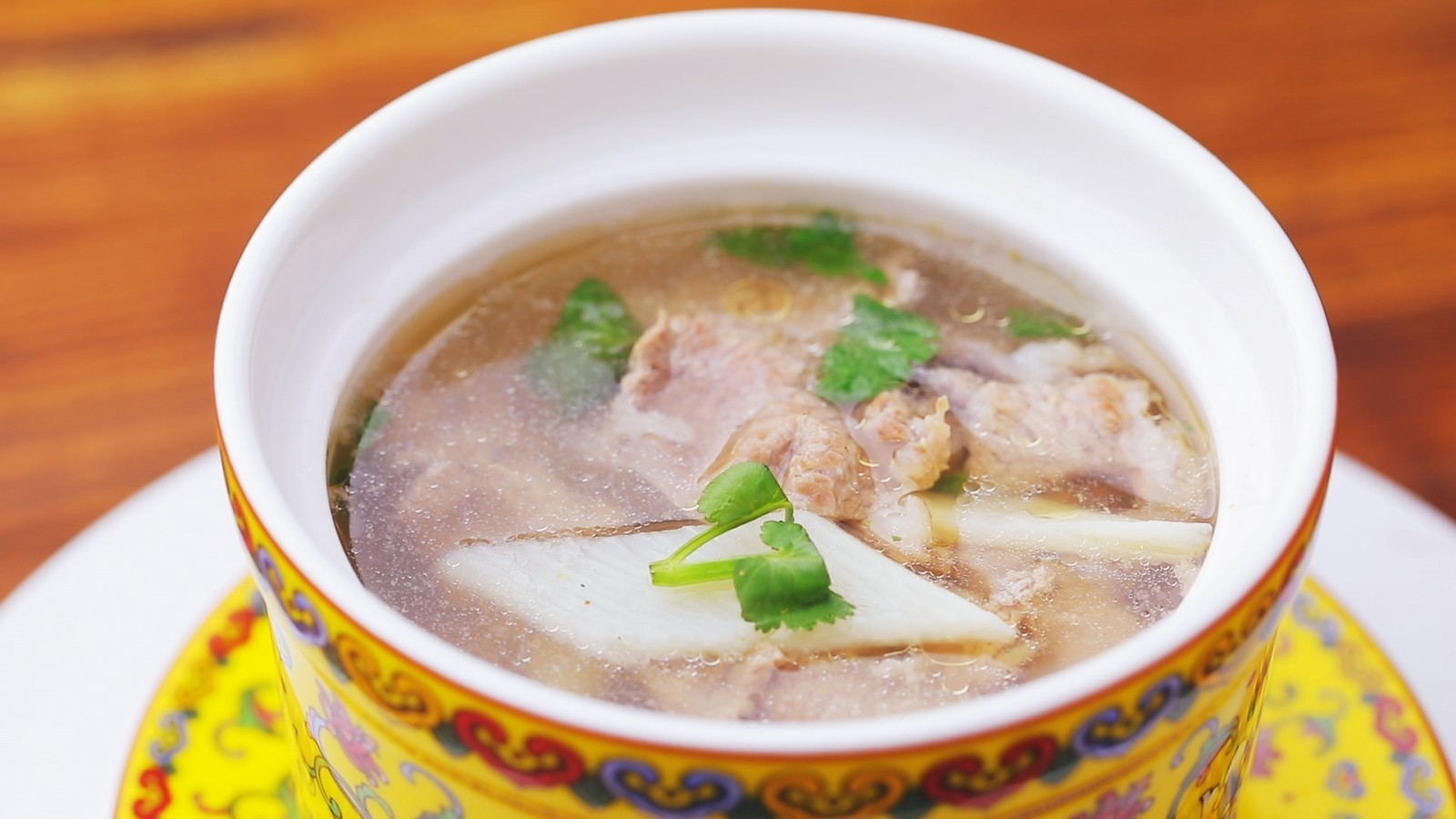 步骤3: 碗中放葱姜丝、香菜、醋、香油、胡椒粉,将羊肉山药连汤浇入碗中即可。