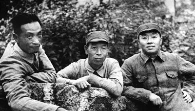 王诤(左)、刘寅(右)和1932年在鄂豫皖苏区抄收过红中社新闻的王子纲,三人开创了中国工农红军无线电通讯事业。