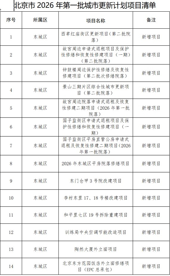 为充分发挥城市更新在首都高质量发展中的重要抓手作用,助力实现一季度“开门红”,近日,北京市发布2026年第一批城市更新计划项目清单。