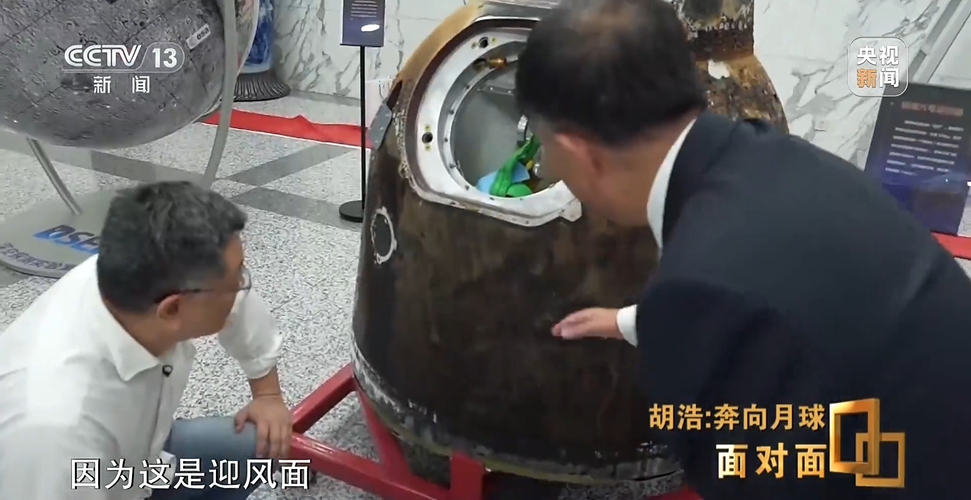 嫦娥六号任务总设计师 胡浩:这些都是烧蚀的,因为是迎风面,我们这次因为路程短了,嫦娥五号跑了6500公里,这个只有5600公里,路程短了,烧蚀量速度还是这么快,所以烧蚀得比嫦娥五号厉害。