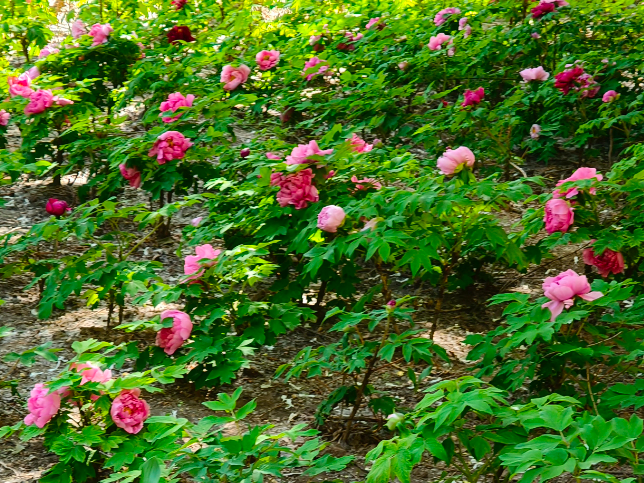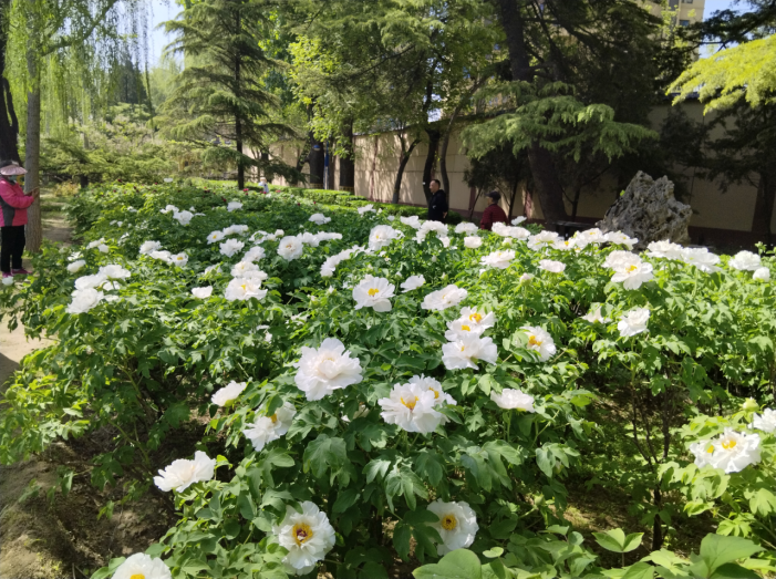朝曦公园牡丹占地面积500余平方米,牡丹品种有赵粉、乌龙捧盛等品种,共计2500余株。
