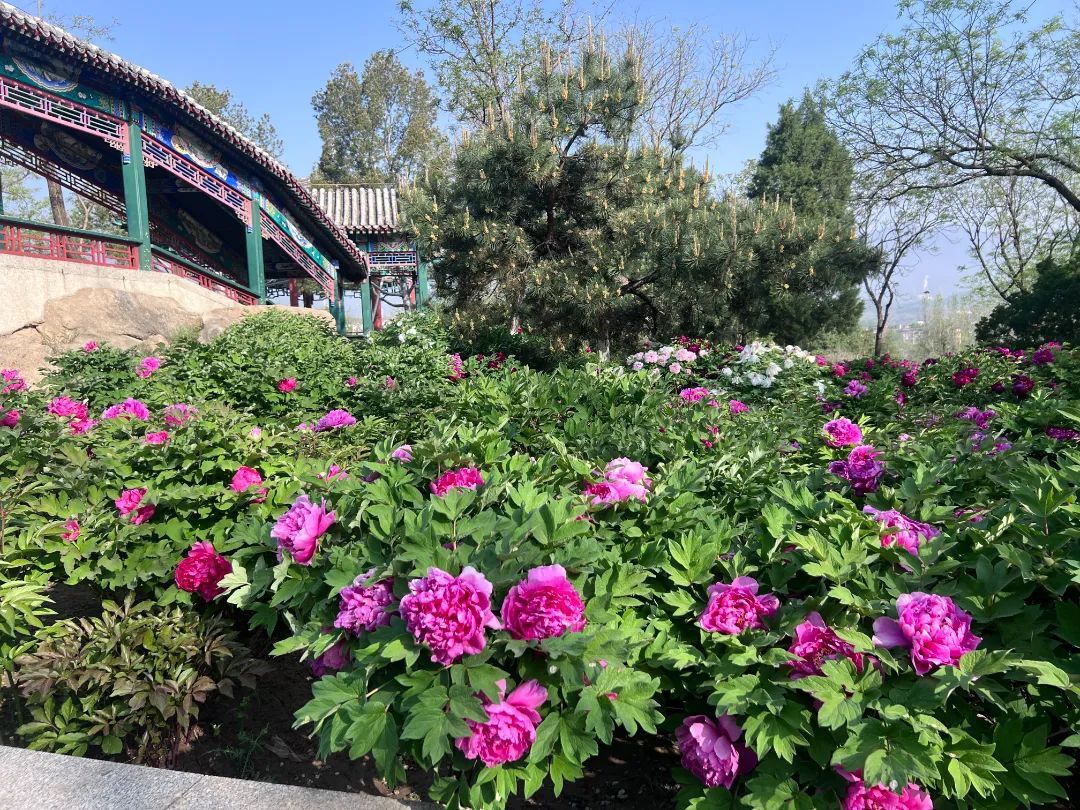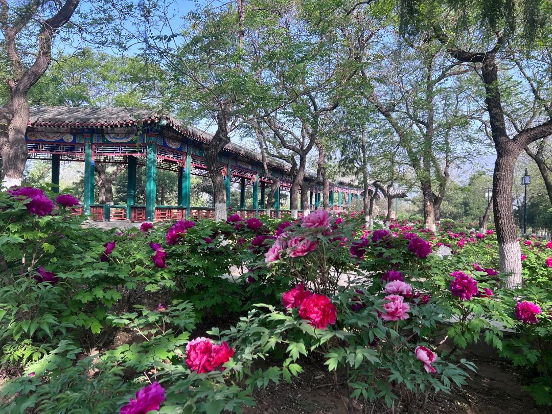 燕山公园牡丹种植主要分布在凌空长廊两侧及四季园,占地面积3000余平方米,牡丹、芍药品种有鲁荷红、赵粉、二乔、凤丹等10余种,共计7000余株。