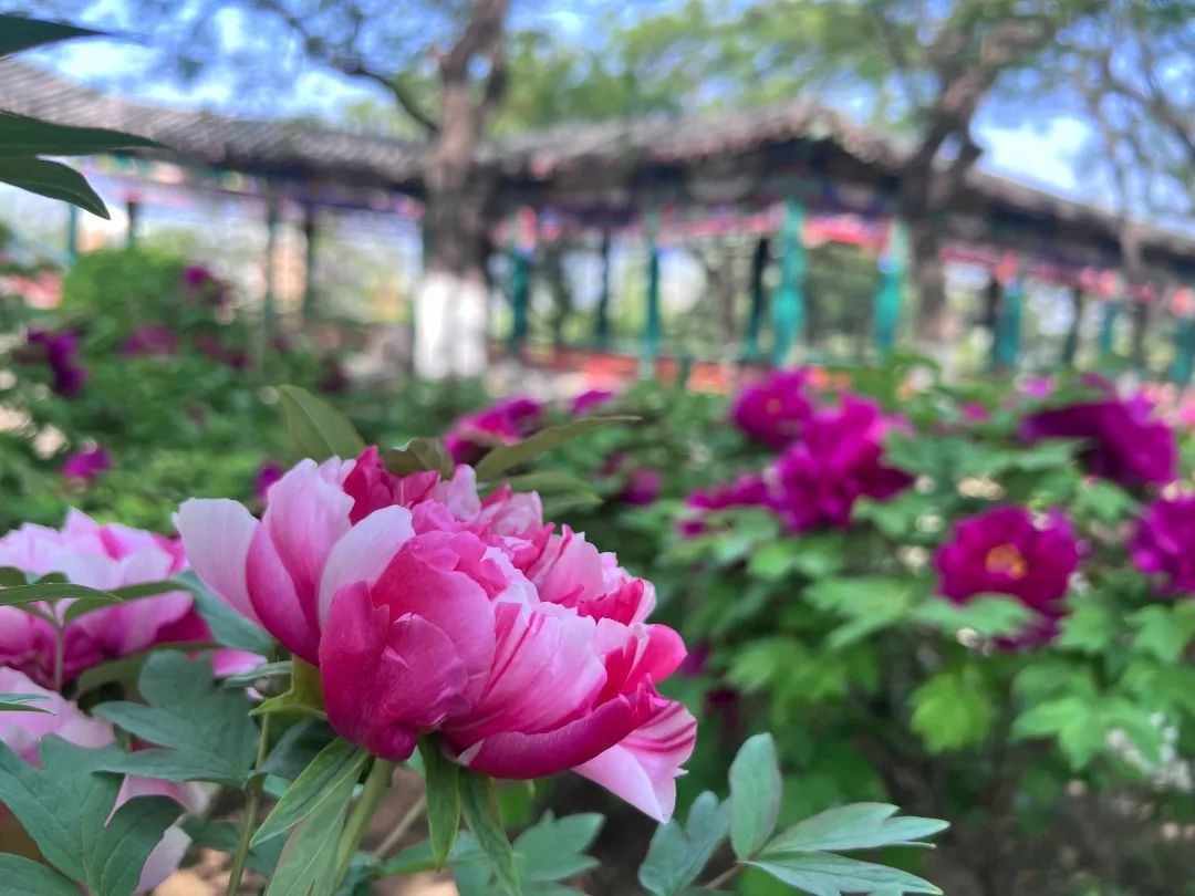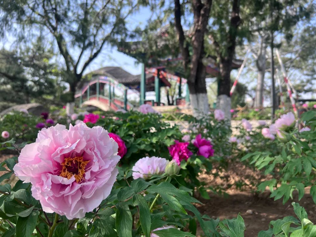 步入牡丹园,一株株牡丹花正迎风绽放。红、白、粉、紫各色交织辉映,将满园染成姹紫嫣红的瑰丽画卷。花瓣一片片铺展开去,形成“色卡级”视觉盛宴。