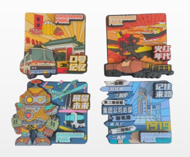 “口号记忆”“火红年代”“记住来路”“展望未来”四个主题造型的冰箱贴各有特色,老首钢人和外来游客都会被其打动。