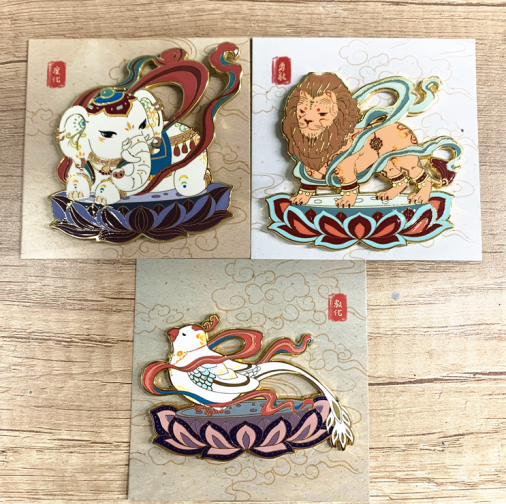 石景山法海寺系列冰箱贴设计灵感来源于法海寺壁画中的鹦鹉、六牙白象和狮子。二次创作后,用仿珐琅工艺将壁画中的神兽们带到大众的视野中,提升大众对法海寺壁画的认知度。