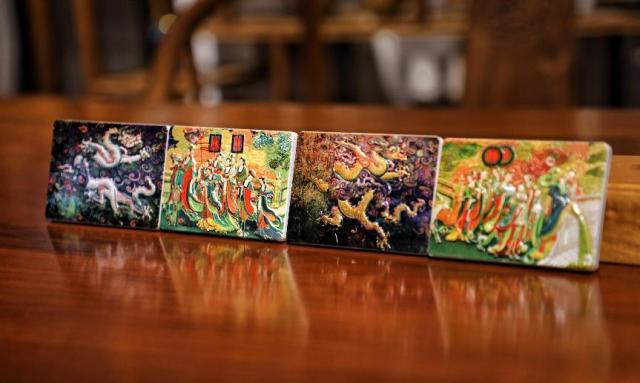 壁画冰箱贴的画面由工美大师根据明代皇家壁画精心上色修复,再现壁画绘就时的工笔重彩、新奇富丽。分别为《帝后放生图》、《帝后放飞图》《黄龙图》《白龙图》。壁画采用沥粉贴金工艺,画面灵动且有层次感,冰箱贴制作以此为灵感,采用立体浮雕工艺,更为立体生动。