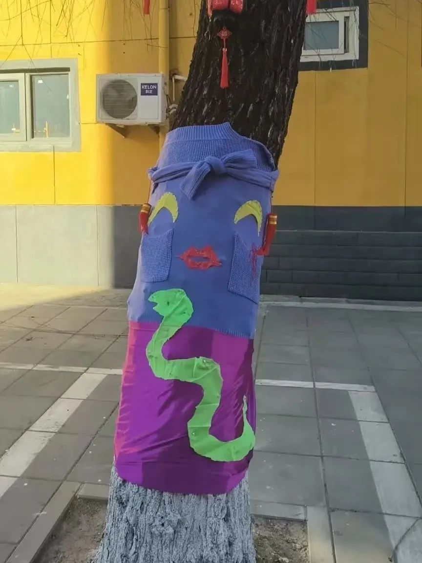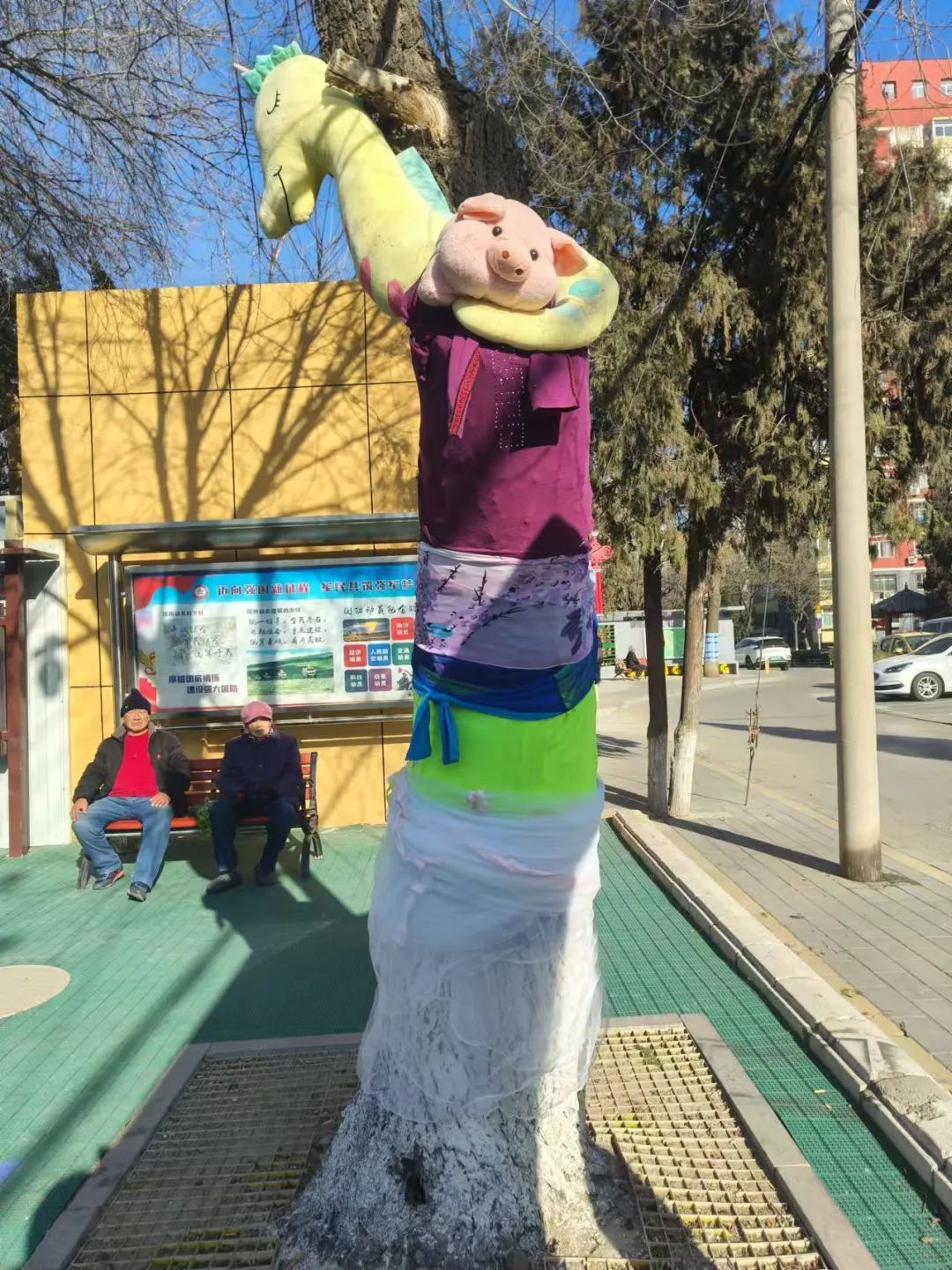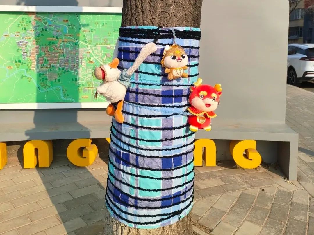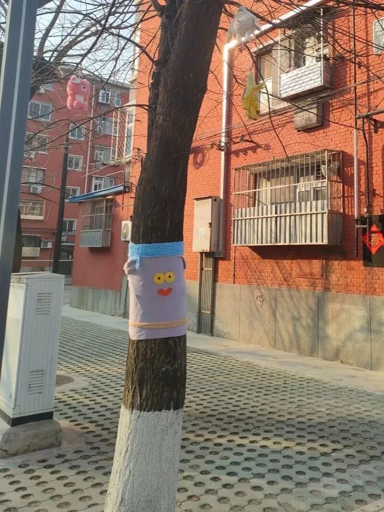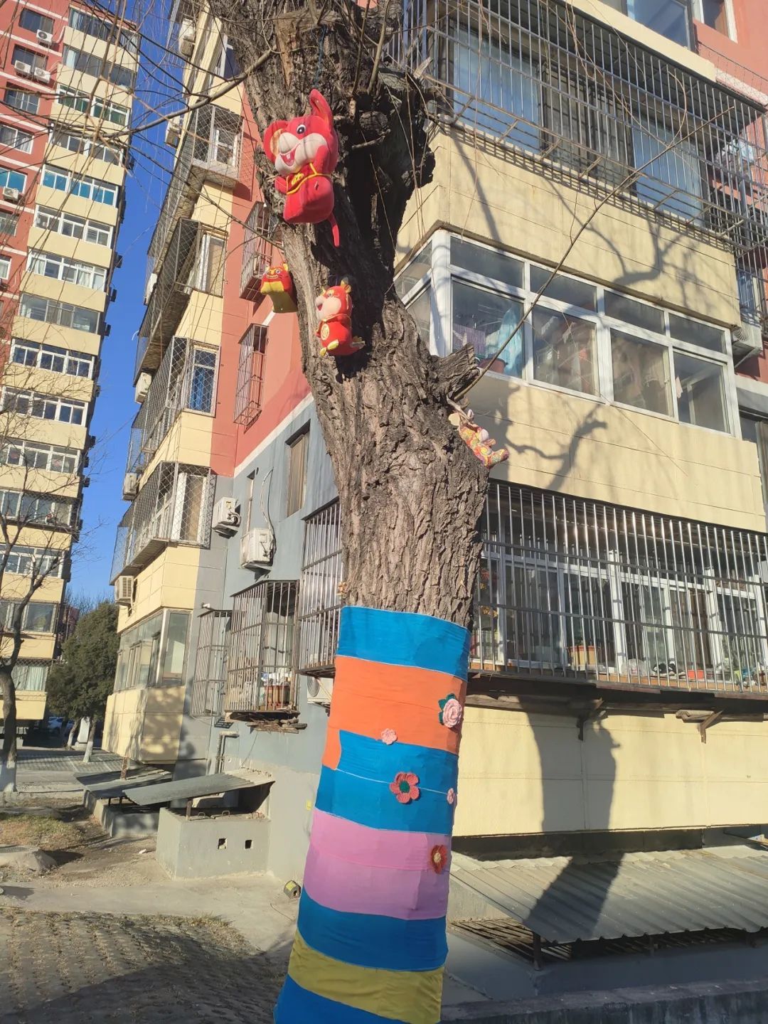 当春日的阳光温柔地洒在燕山向阳街道宏塔社区,一幅幅充满童趣的画面悄然闯入大家的视线。瞧,小区里那些原本略显孤寂的大树如今像是被施了神奇魔法一般,摇身一变,成了可爱的“童话主角”。