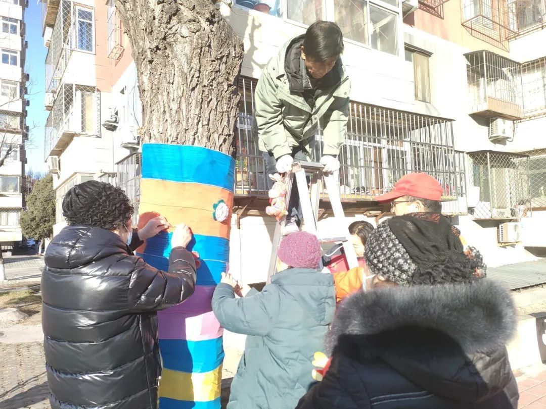 有的居民提议用彩色的毛线编织成温暖的“毛衣”和图案,给树木穿上;有的居民提出用家里废旧的布料拼接成漂亮的“套装”,让树木展现出别样的风采;有的居民希望把家里闲置的小布偶挂上,大小朋友们肯定都喜欢。宏塔社区各支部迅速成立了“树木穿衣小组”,大家分工明确,各司其职,很多居民踊跃将家中闲置的衣物和布偶整理出来,统一交给组长。女士们编织裁剪,细心设计,男同志们登高挂物,各显其能。