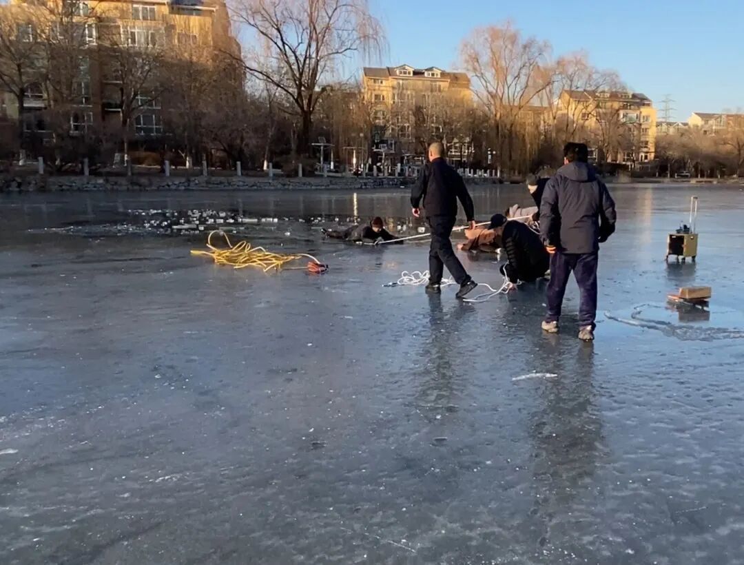 2月8日下午4时许,顺义区东方太阳城社区人工湖发生惊险一幕:一位大妈在结冰的湖面上滑冰车时,因冰面开裂坠入冰冷的湖中。其老伴儿上前营救,也不慎坠湖。正在湖边带孩子游玩的同小区居民王小磊不顾个人安危,趴在冰上匍匐施救。在妻子与热心居民、物业人员的接力帮助下,成功将两位落水老人救上岸。