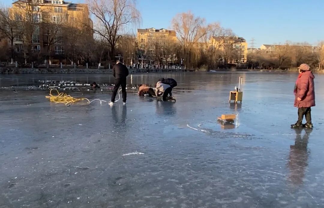 事发当天,多名居民在社区人工湖背阴处的冰面上滑冰。一位大妈滑着冰车进入阳光照射区域时,较薄的冰面突然开裂,她连人带车坠入湖中。大妈的老伴儿见状急忙上前施救,不料冰面再次破裂,大爷也落入湖中。湖水冰凉刺骨,水已淹至老人的肩头。