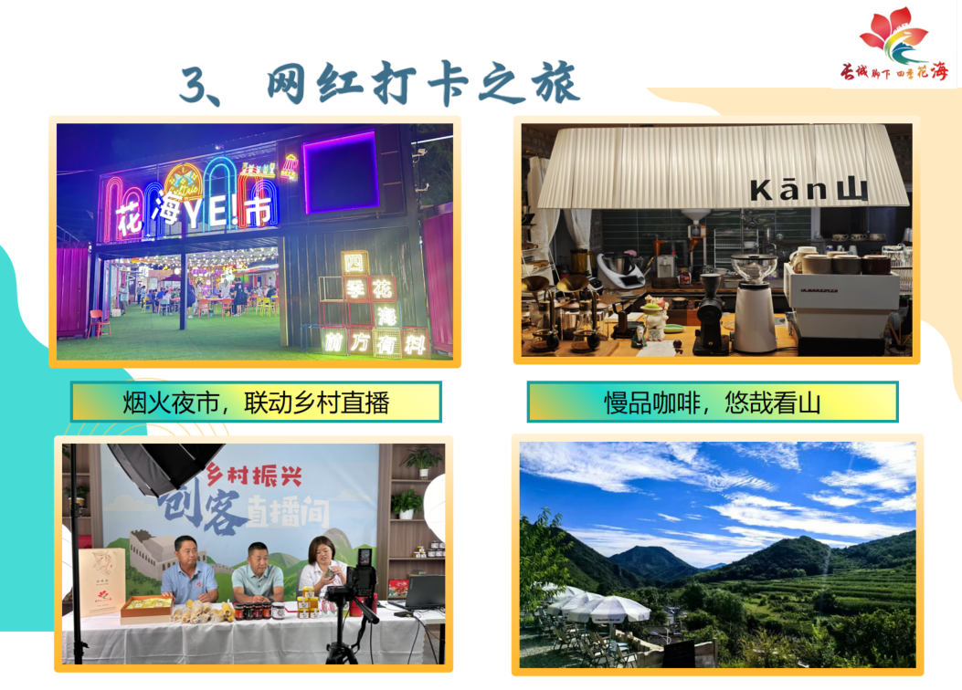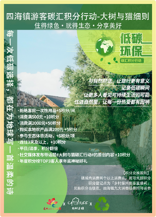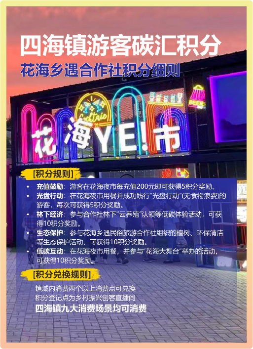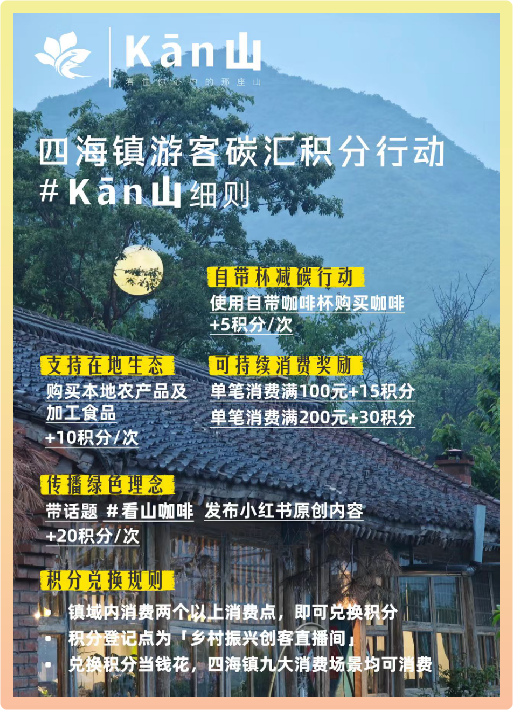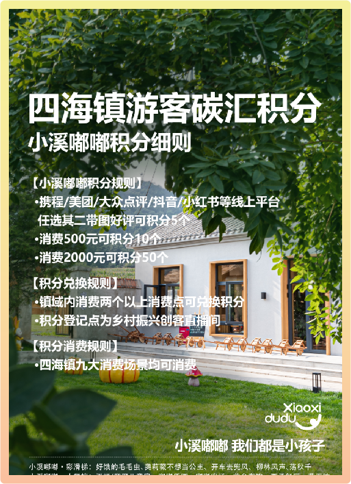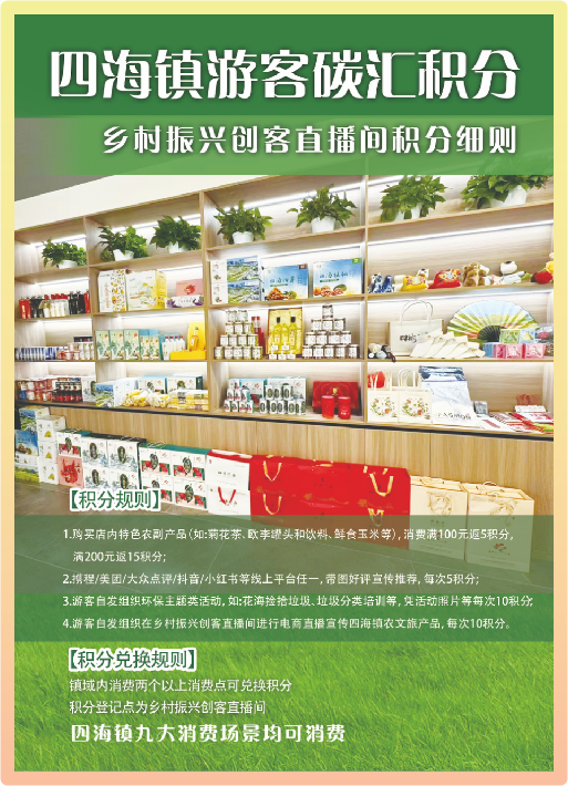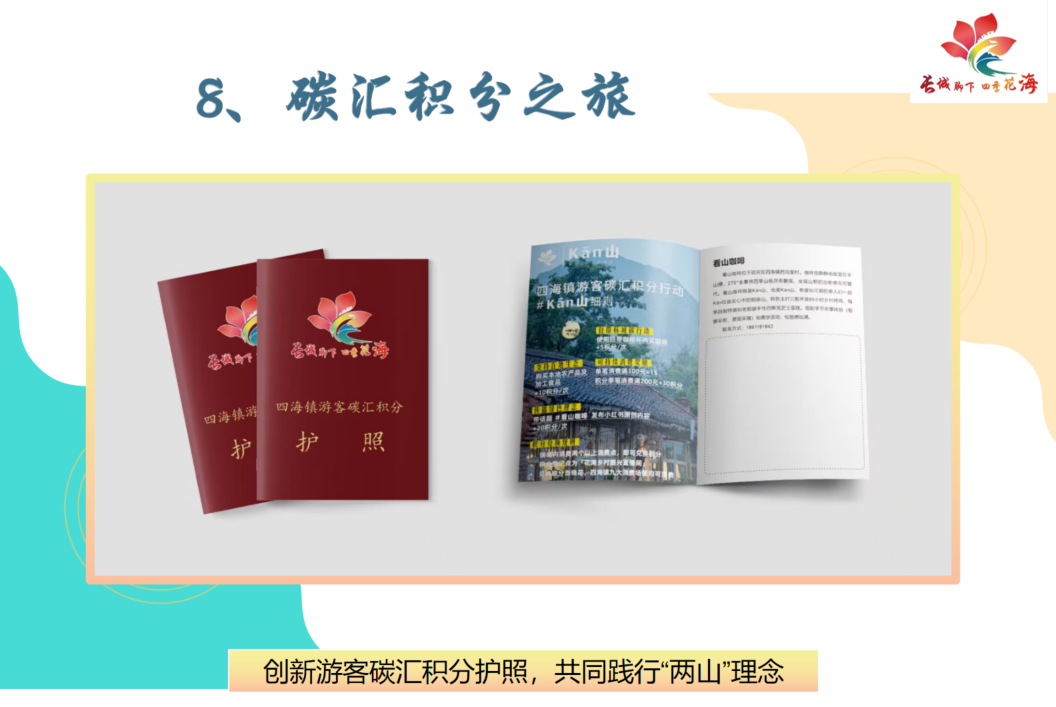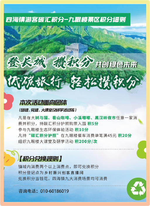 继1月推广“生态积分存折”、3月推出全市首个覆盖村民与企业的双主体生态积分制、6月启动村干部生态绩效考核后,此次旅游季,四海镇发布游客碳汇积分“护照”,形成村、企、民、游多主体生态积分体系。8月15日至12月31日,游客在九眼楼长城、看山咖啡等“六大低碳体验场景”参与生态保护活动并打卡可累积积分,打卡满两处场景后,即可在乡村振兴创客直播间激活“护照”。凭“护照”可在镇域内“九大消费场景”购买四海特产、品尝四海美食、体验四海民宿、打卡四海景点、畅享四海乐趣。