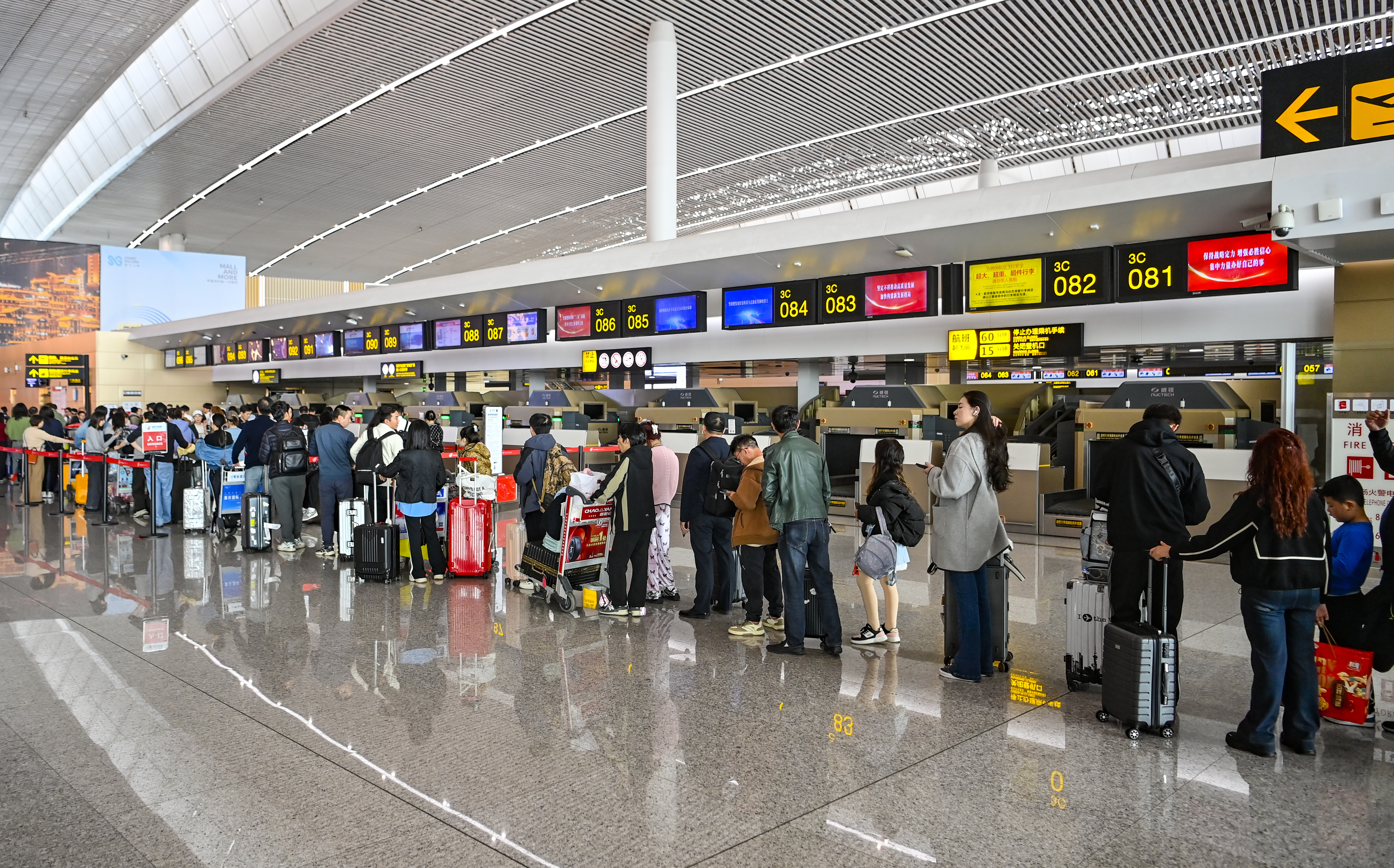 ▲2026年2月23日,重庆江北国际机场,旅客排队进行值机。记者 齐岚森 摄