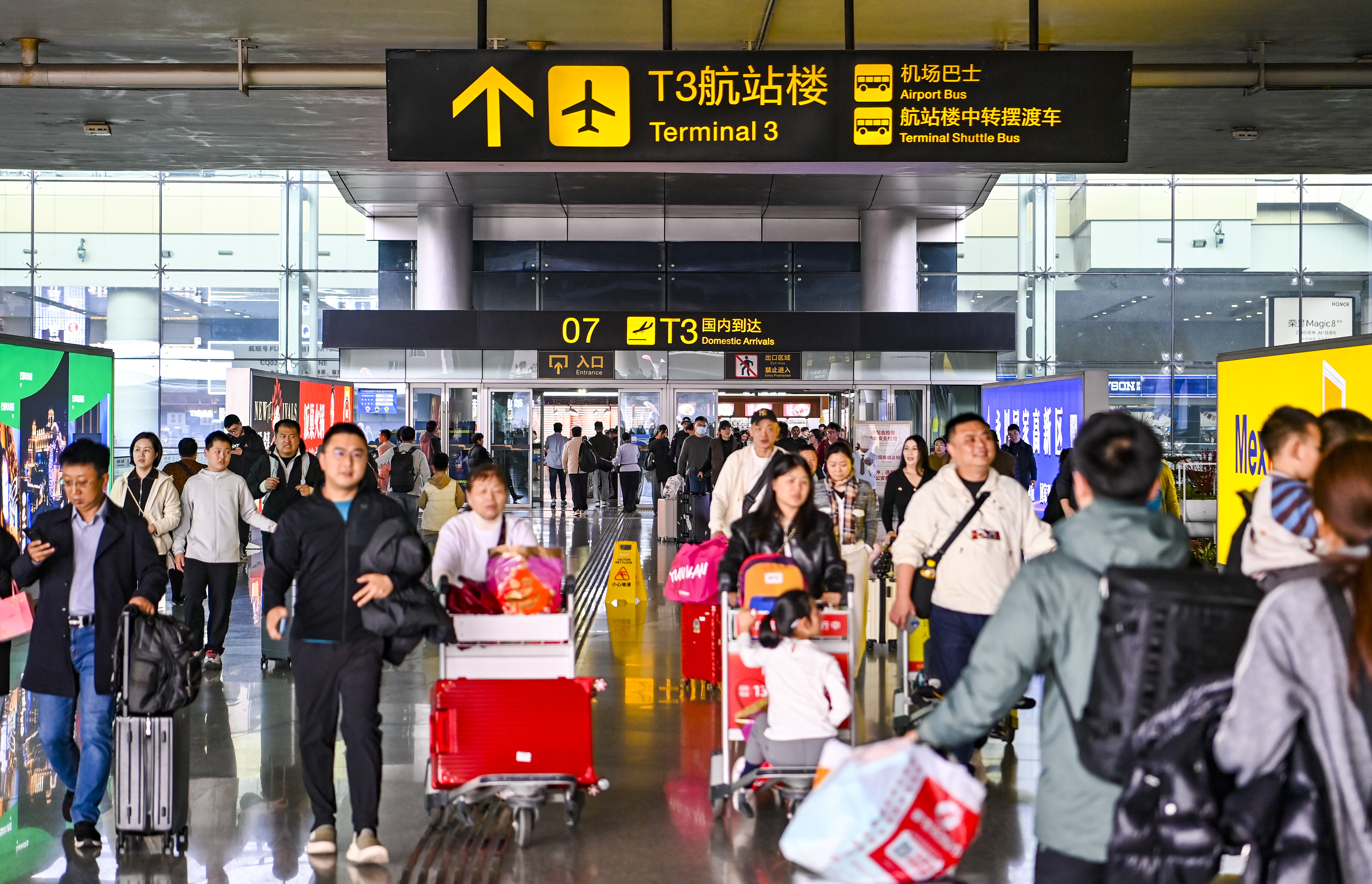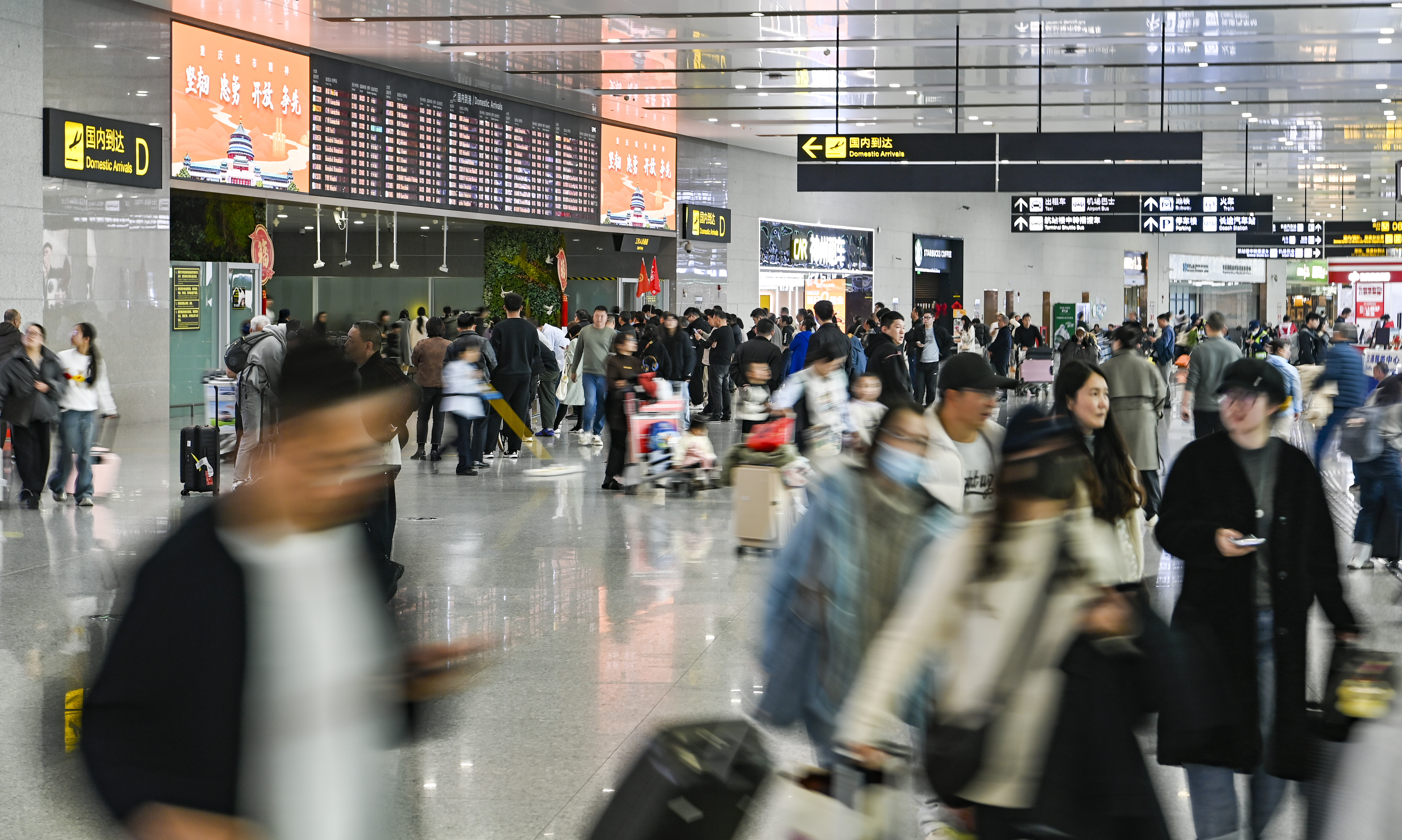 ▲2月23日,重庆江北国际机场,国内到达处人潮涌动。记者 齐岚森 摄