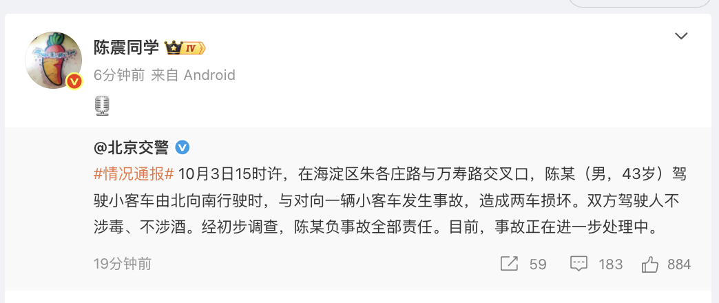 北京交警通报:陈某(男,43岁),事故全责!_北京时间