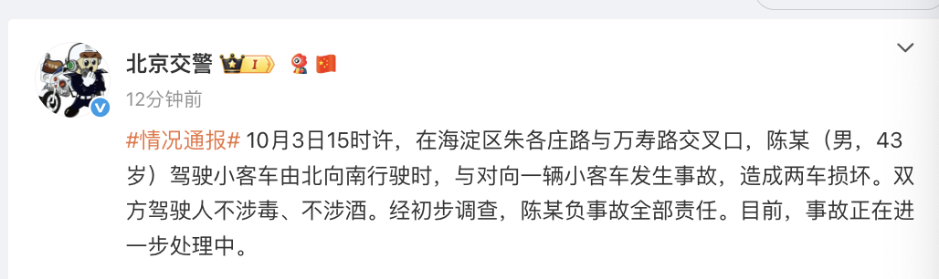 10月4日,@北京交警 发布通报:10月3日15时许,在海淀区朱各庄路与万寿路交叉口,陈某(男,43岁)驾驶小客车由北向南行驶时,与对向一辆小客车发生事故,造成两车损坏。双方驾驶人不涉毒、不涉酒。经初步调查,陈某负事故全部责任。目前,事故正在进一步处理中。