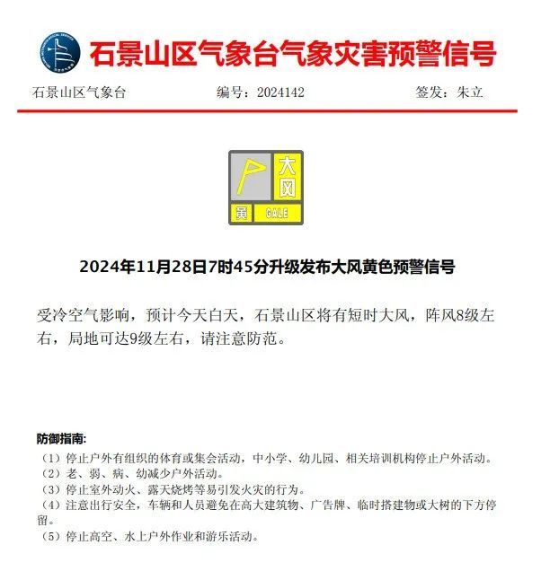 石景山区气象灾害预警中心2024年11月28日7时45分升级发布大风黄色预警信号:受冷空气影响,预计今天白天,石景山区将有短时大风,阵风8级左右,局地可达9级左右。