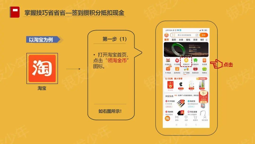 第一步:打开淘宝首页,点击“领淘金币”图标。