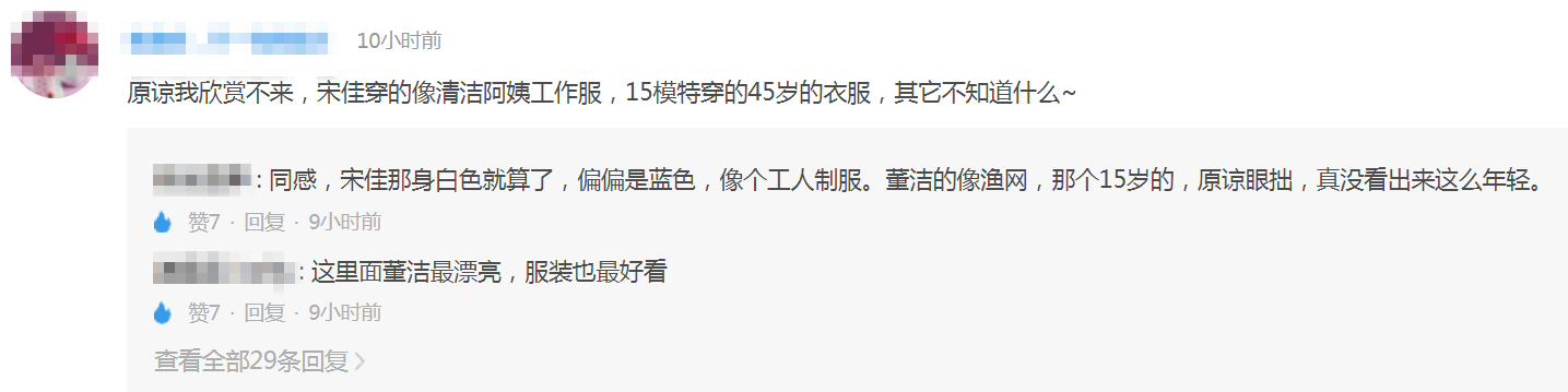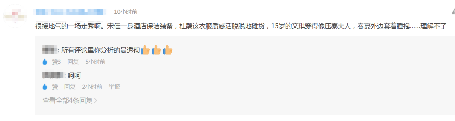 宋佳穿着蓝色的套装,看起来十分有气场,自带高冷气质,就像天生的模特儿一样,不过却有网友评论称:宋佳穿的像清洁阿姨工作服现在文琪只是一个15岁的小女孩,却穿着大人的衣服,留着中分的发型,被吐槽太丑有网友直言:15岁的文琪穿得像压寨夫人5...