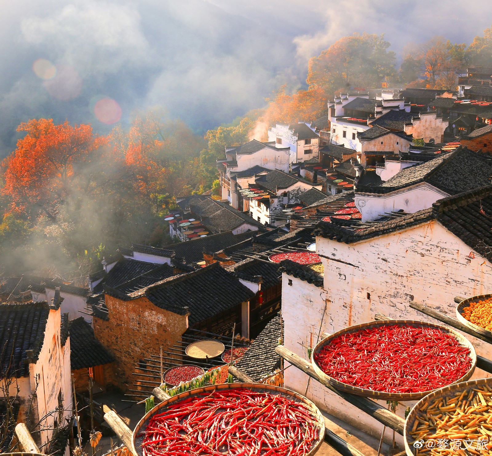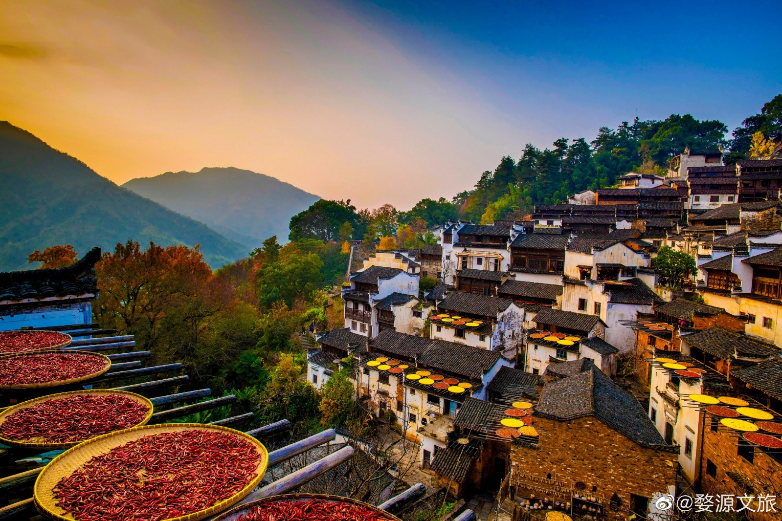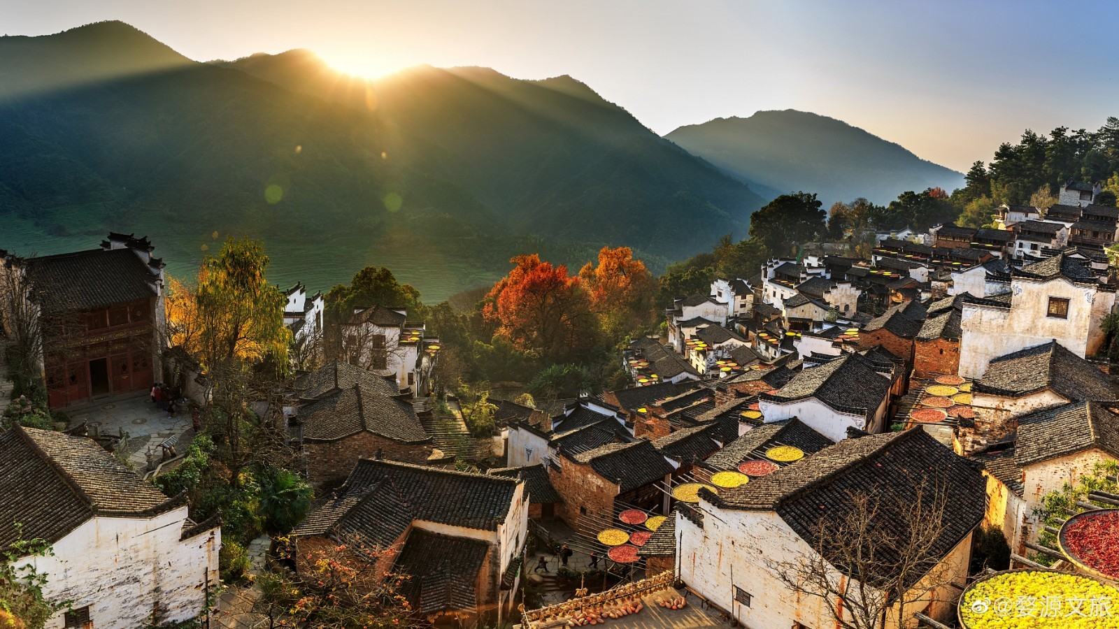 建村于明代中叶的篁岭古村属典型山居村落,上百栋徽派建筑围绕水口呈扇形梯状错落排布。篁岭不断传承发扬特有晒秋文化和民俗文化,使婺源篁岭已成为中国乡村旅游的一张特色名片。