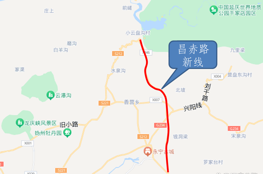 昌赤路新线由延庆公路分局建设,道路规划等级为一级公路,全长15.66公里。本次新开通路段长度为2.8公里,起点位于永宁镇王家山村,终点位于永宁镇永偏路。