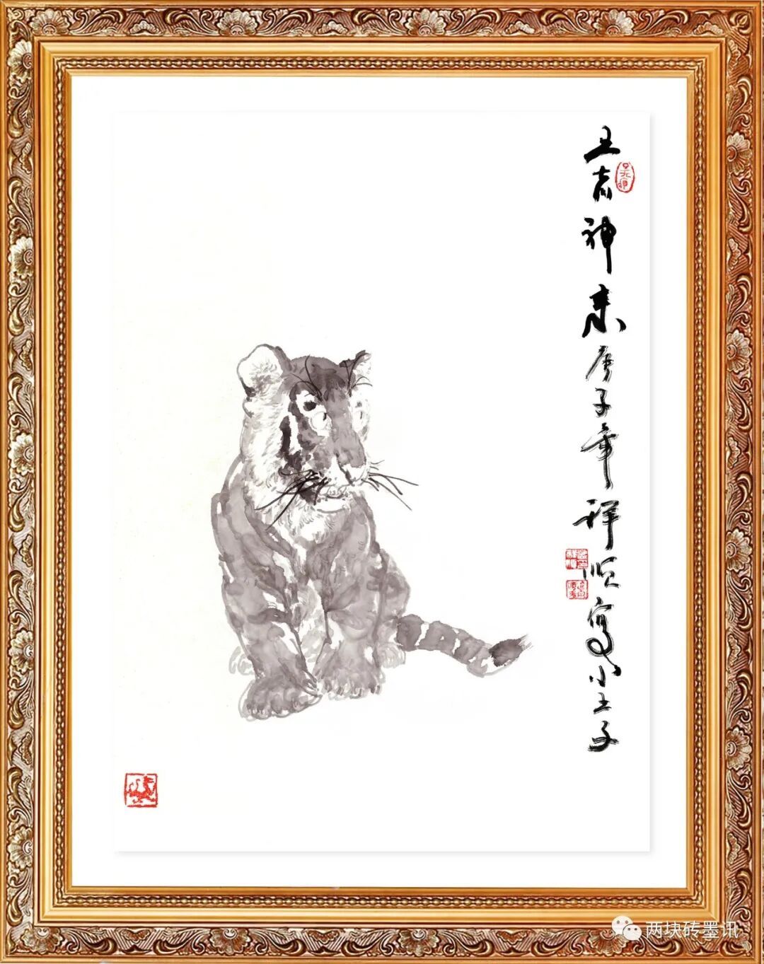 诗的第二句“独步高丘亦顺祥”,是表扬他的画虎取得了很大的成就,达到了很高的境界,但依然能够不忘初心,保持着安祥和顺的态度。大凡艺人取得了些许成绩,总是容易趾高气扬,忘乎所以,目空一切,睥睨万物,但孟兄没沾染这些习气。独步高丘,亦有耐得住寂寞、认准既定目标、砥砺前行的意思。最后两句“护子回眸发长啸,慈光到处百花香”,则是从鲁迅先生的绝句“无情未必真豪杰,怜子如何不丈夫。知否兴风狂啸者,回眸时看小於菟”变化而来。虎乃猛兽之王,其咆哮呼啸令星月颤栗、百兽慑服,其威其凶、其狠其残,自是其形象中本具之义,画家画虎,也多是表现这些方面。但虎性中亦有慈的方面,这方面多被文人和画师忽略,但鲁迅先生注意到了,孟祥顺先生在其后期的作品中也注意到了。画出虎之威,画师皆能也,而画出虎之慈,画师多不能也。盖欲画虎之慈须先具慈悲之心,是宗教意义上的慈悲,不是世俗意义上的慈善,这是参透大自然玄机明白万物互生互噬方能绵延进化生生不息之后的觉悟。至此境界,即知万物相依众生平等。人虽为万物灵长,但也要放低身架,与万物同生共长,不因虎食弱类而恶之,因弱类之下更有弱类也,却以虎舐於菟而亲之,因由虎之慈可及人之慈,虎性人性亦相通也。