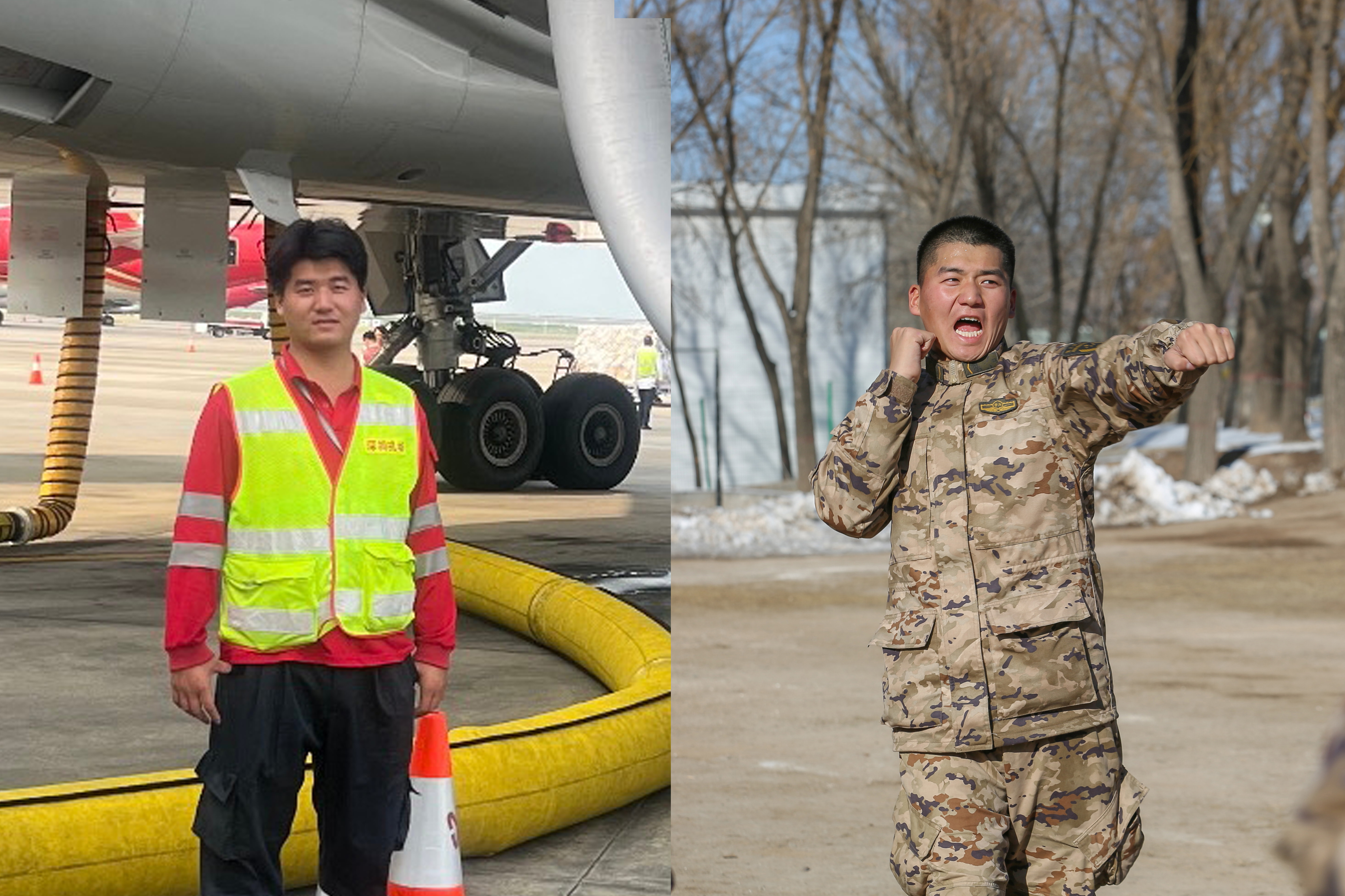 图为三班张硕入伍前在机场工作和现在的对比照。被采访者供图