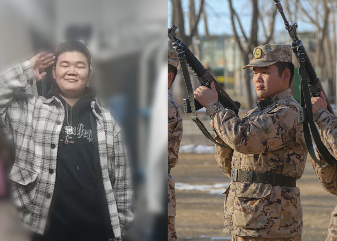 图为二班张硕上学时和现在入伍后的对比照。被采访者供图