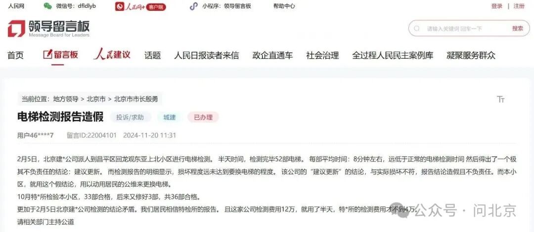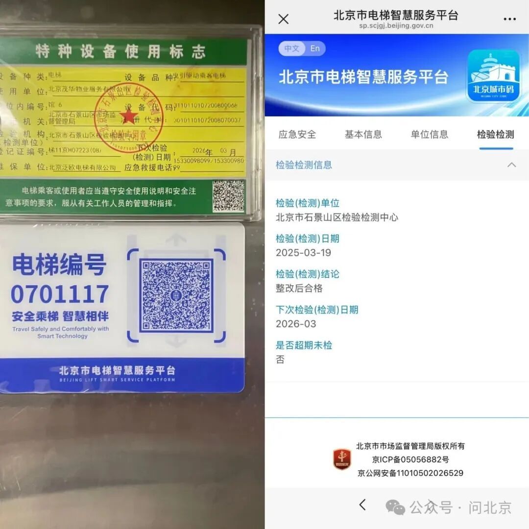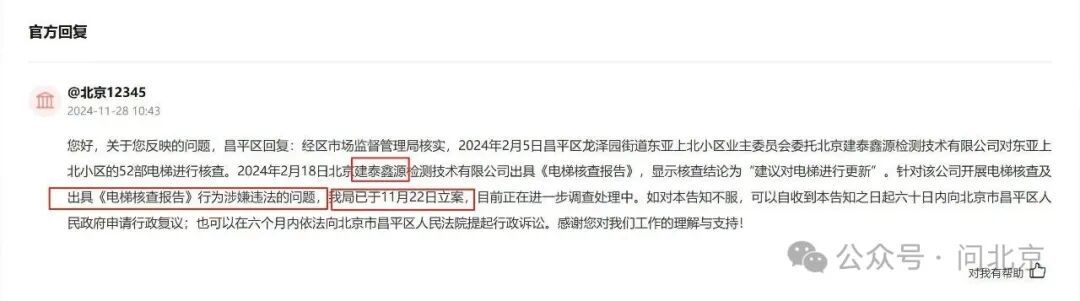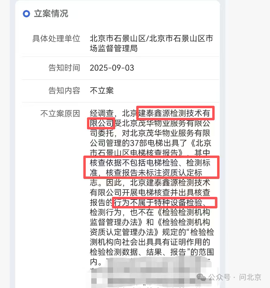 “问北京”记者了解到,现已有业主就建泰鑫源公司出具的《电梯核查报告》向石景山区市场监督管理局投诉,虽未被立案,但据石景山区市场监督管理局回复:“经调查,北京建泰鑫源检测技术有限公司受北京茂华物业服务有限公司委托,对北京茂华物业服务有限公司管理的37部电梯出具了《北京市石景山区电梯核查报告》,其中核查依据不包括电梯检验、检测标准,核查报告未标注资质认定标志。因此北京建泰鑫源检测技术有限公司开展电梯核查并出具核查报告的行为不属于特种设备检验、检测行为,也不在《检验检测机构监督管理办法》和《检验检测机构资质认定管理办法》规定的“检验检测机构向社会出具具有证明作用的检验检测数据、结果、报告”的范围内。