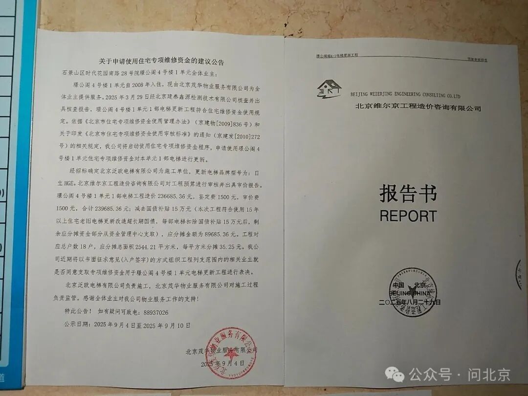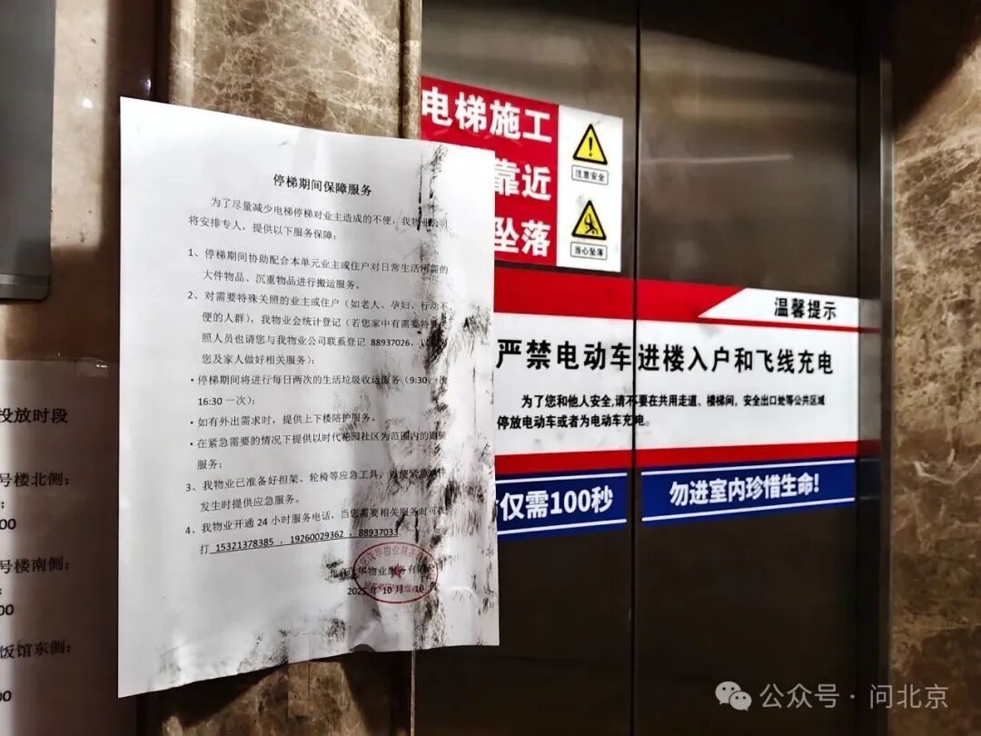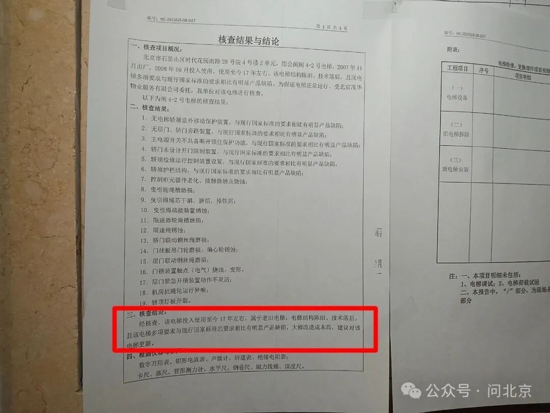 “问北京”记者在小区多个单元内看到,物业张贴的公告显示,今年3月29日,北京建泰鑫源检测技术有限公司受物业委托,对电梯进行核查并出具报告。报告显示,电梯已使用约17年,属于老旧电梯,技术落后、结构陈旧,且该电梯多项要求与现行国家标准的要求相比,有明显产品缺陷,大修改造成本高,建议对电梯更新。